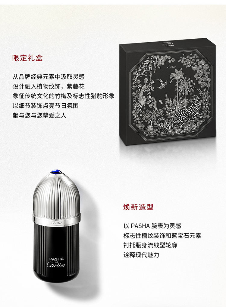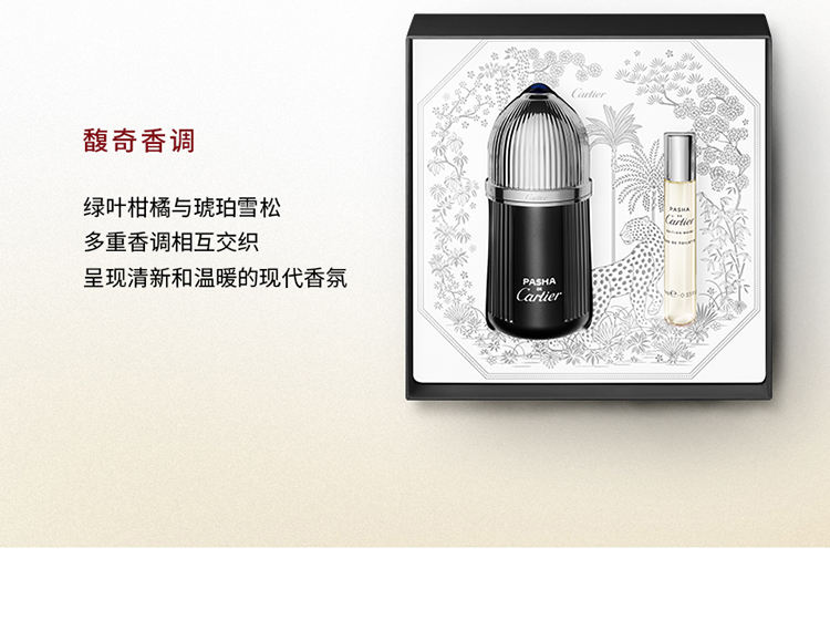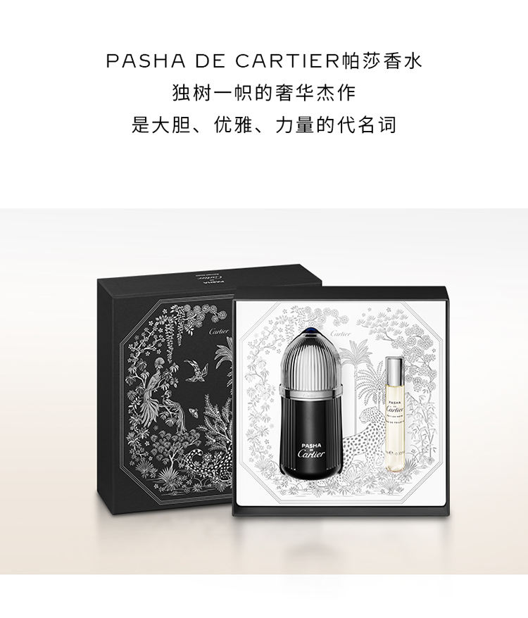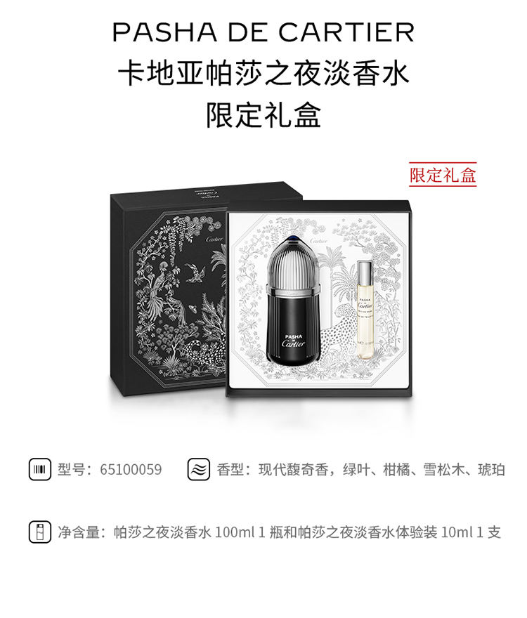套装包含Pasha de Cartier Édition Noire帕莎之夜淡香水100毫升装及1支10毫升体验装。