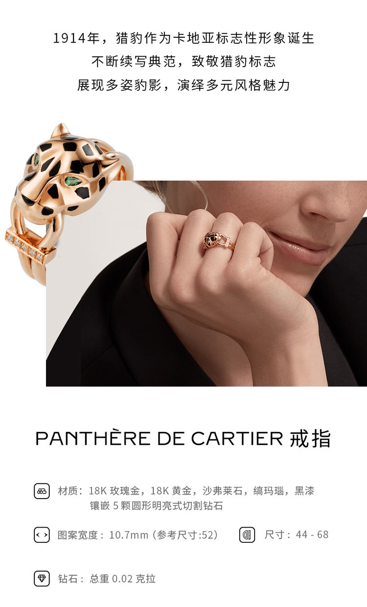 Panthère de Cartier卡地亚猎豹戒指,750‰黄金,黑漆,镶嵌5颗圆形明亮式切割钻石,总重0.02克拉,沙弗莱石。图案宽度:10.7 毫米(适用尺寸:52)。