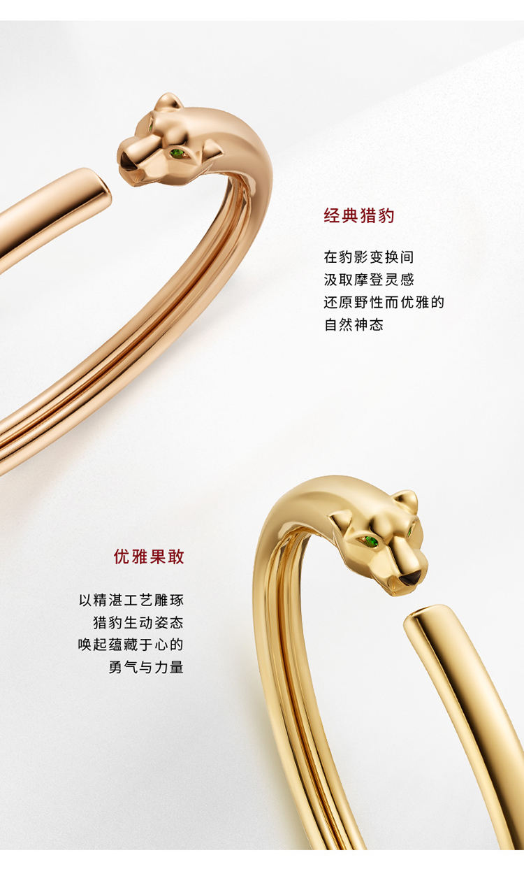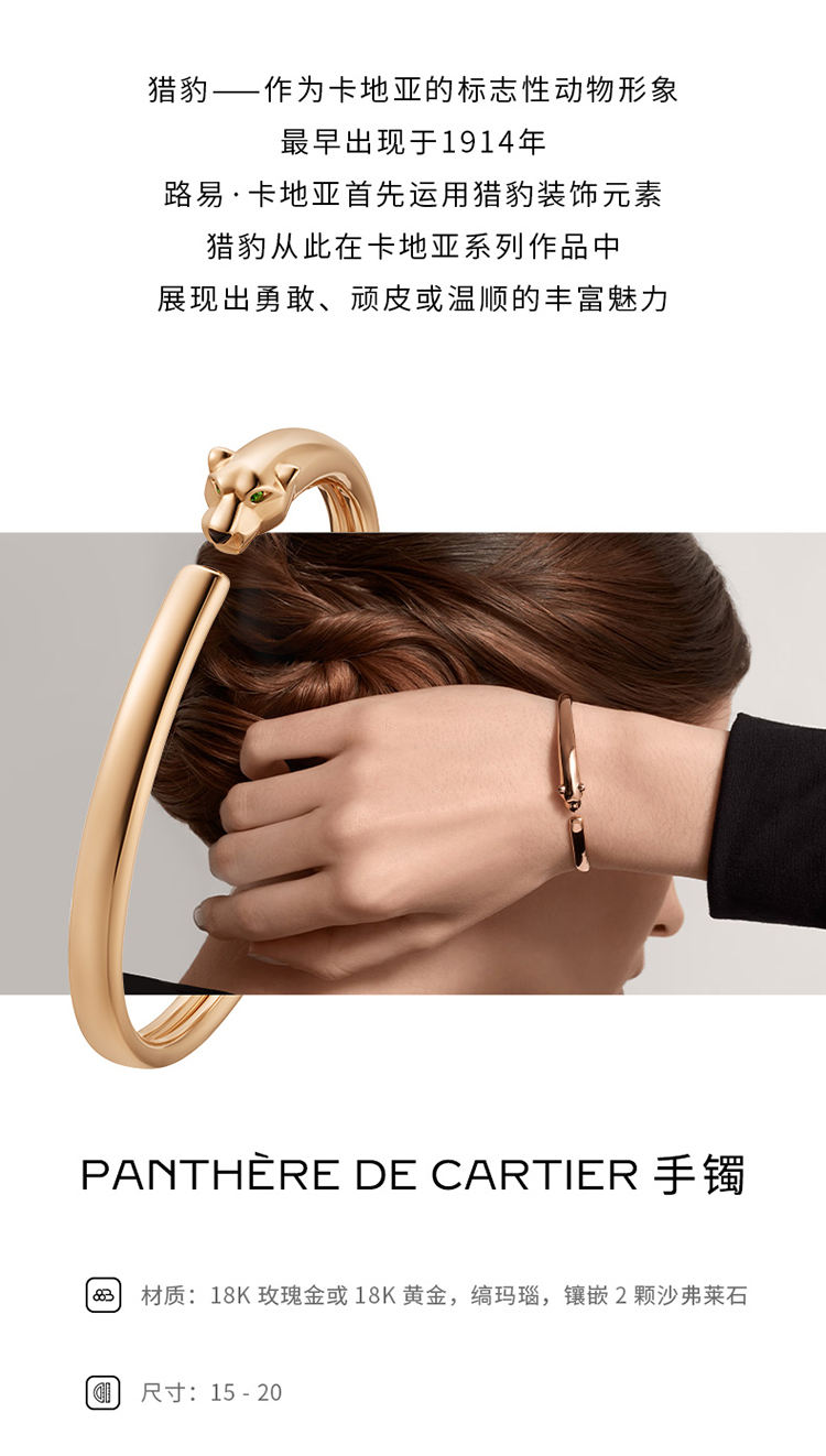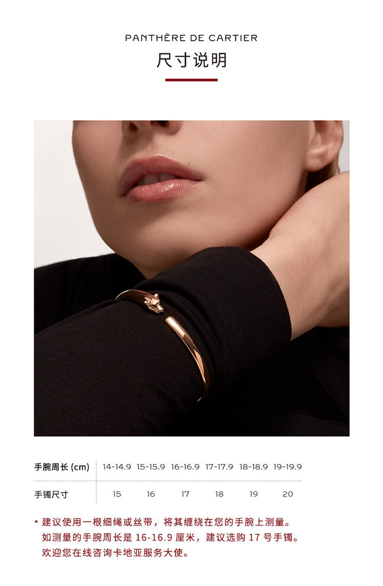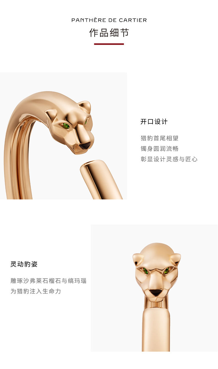 Panthère de Cartier卡地亚猎豹手镯,750/1000玫瑰金,缟玛瑙,镶嵌2颗沙弗莱石(适用尺寸:17)。根据您所订购作品的尺寸不同,宝石克拉重量、宝石数量和作品大小可能存在差异。如需了解详情,请联系卡地亚服务大使。