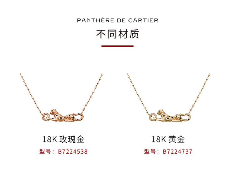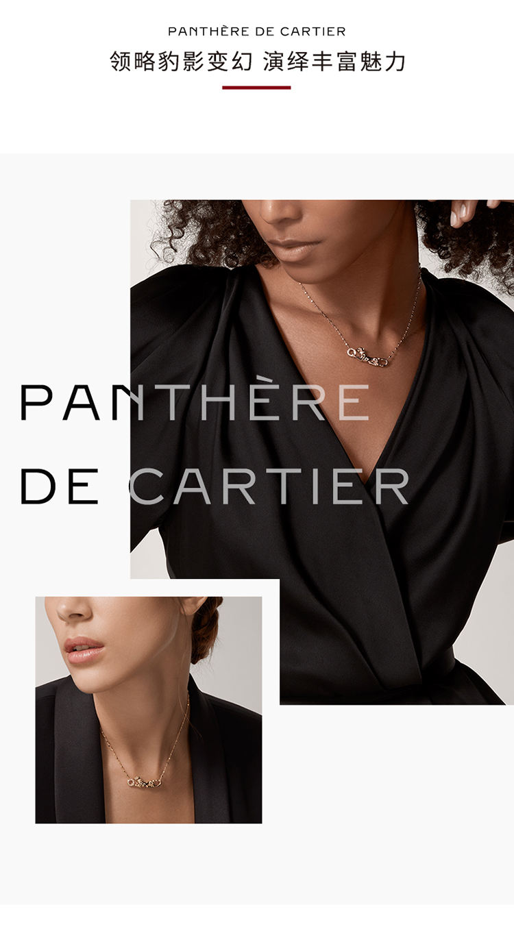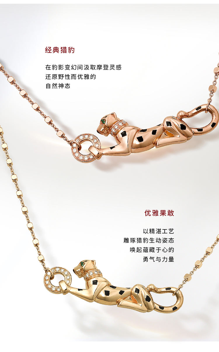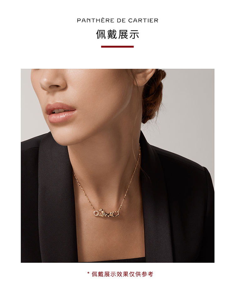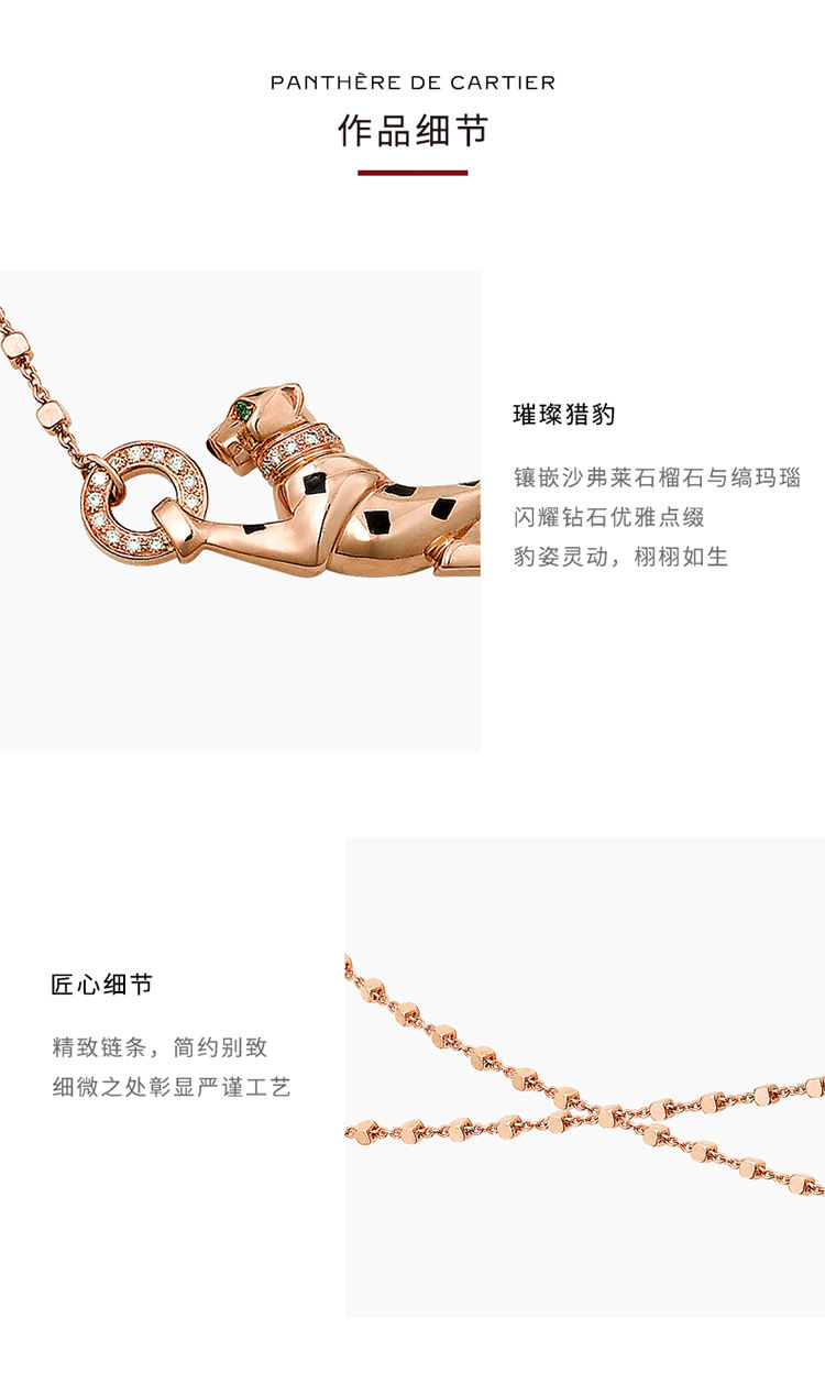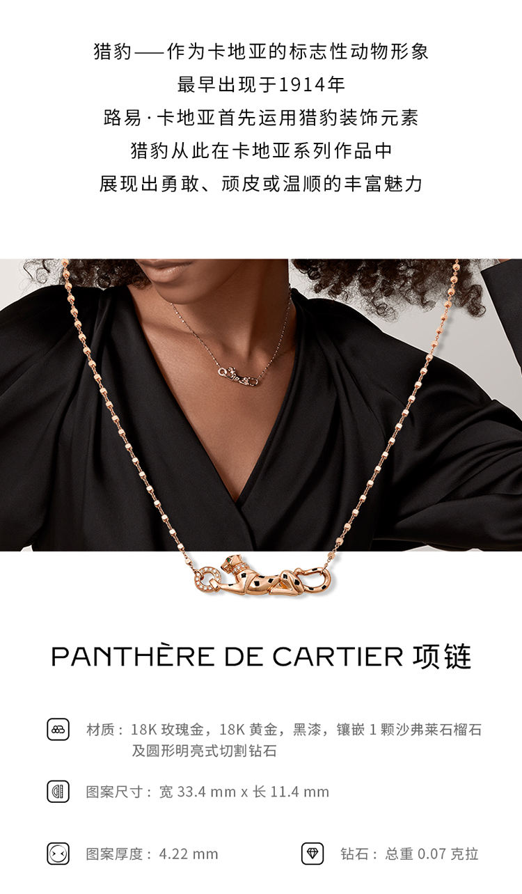 Panthère de Cartier卡地亚猎豹系列项链,750‰玫瑰金,黑漆,镶嵌1颗沙弗莱石榴石及19颗圆形明亮式切割钻石,总重0.07克拉。图案宽度:33.4毫米。图案厚度:4.22毫米。图案长度:11.4毫米。根据您所订购作品的尺寸不同,宝石克拉重量、宝石数量和作品大小可能存在差异。如需了解详情,请联系卡地亚服务大使。