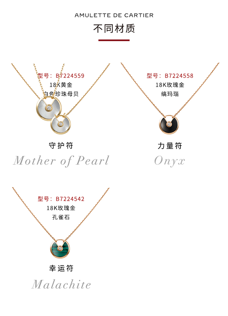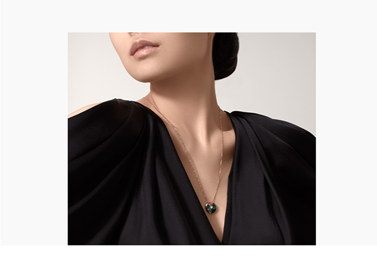 Amulette de Cartier项链,小号款,750‰玫瑰金,孔雀石,镶嵌一颗圆形明亮式切割钻石,重0.09克拉。图案直径:17毫米。链条:60厘米。