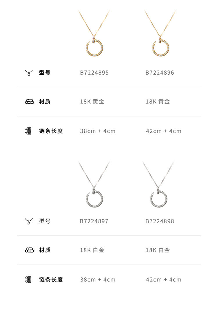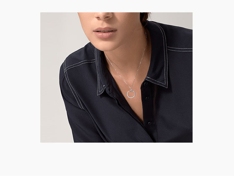 作品说明: - 750/1000白金 - 镶嵌36颗圆形明亮式切割钻石,总重0.38克拉 -可调节链条长度:38和42厘米 - 吊坠直径:18.6毫米根据您所订购作品的尺寸不同,宝石克拉重量、宝石数量和作品大小可能存在差异。如需了解详情,请联系卡地亚服务大使。