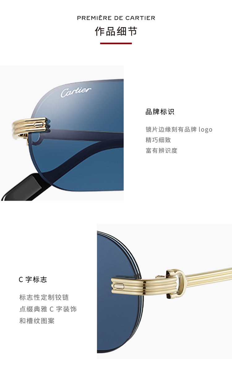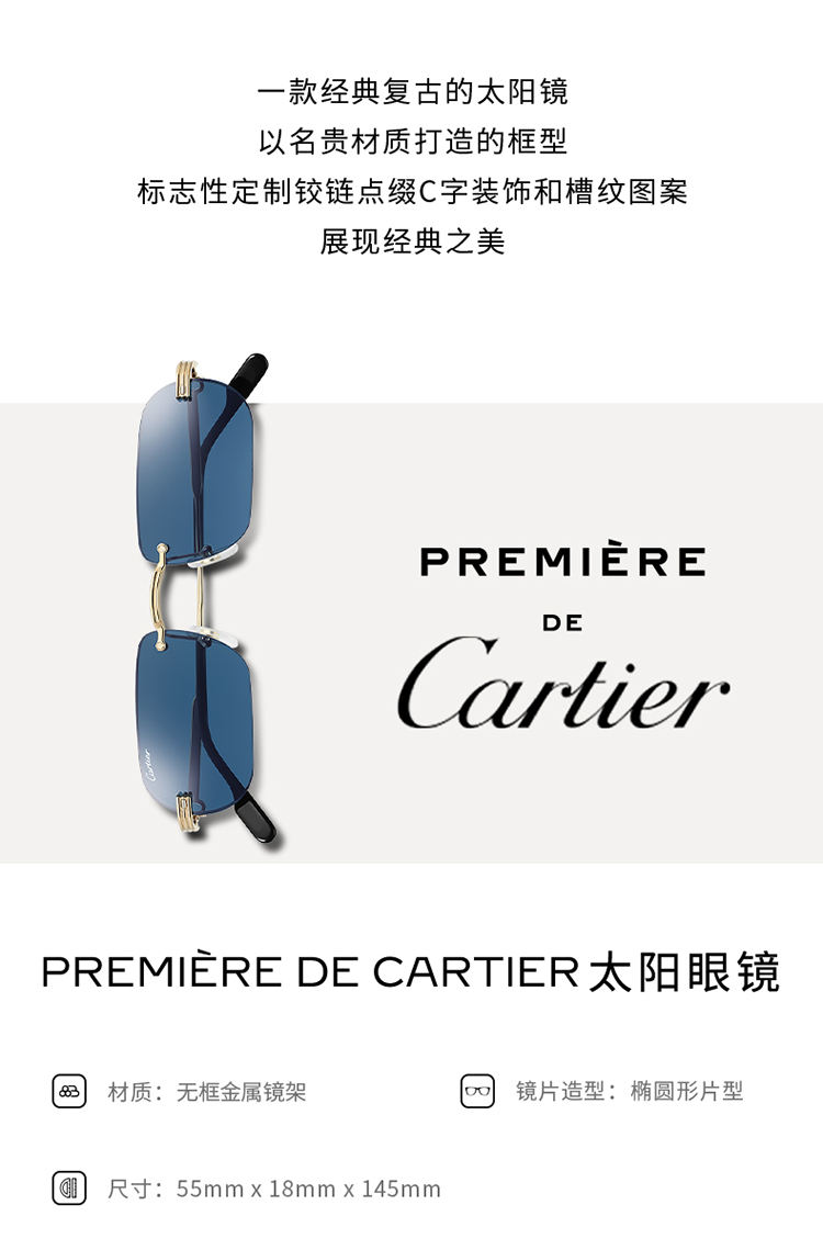 Première de Cartier太阳眼镜,无框金属镜架,抛光镀铂饰面,椭圆形片型,绿色镜片。尺寸:55 x 18 x 145毫米。