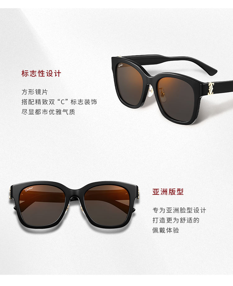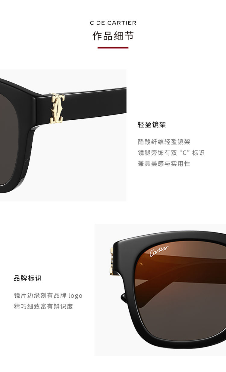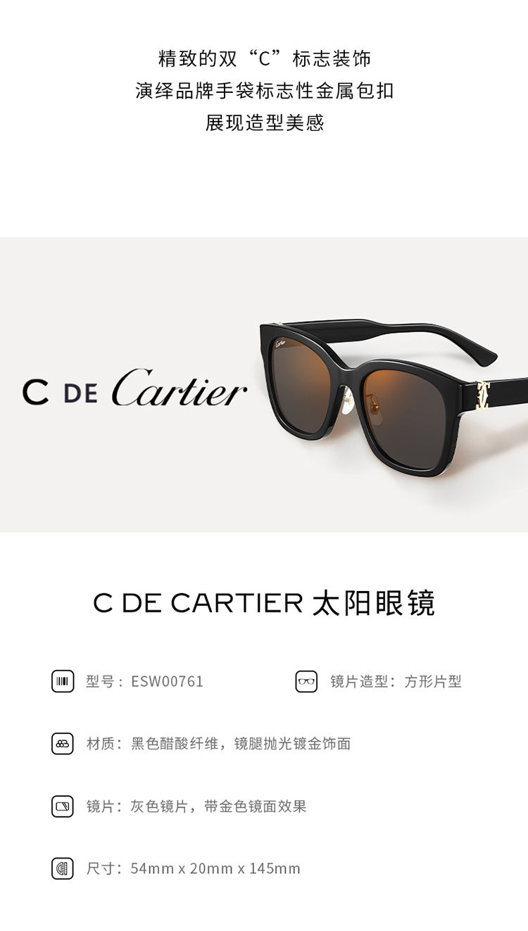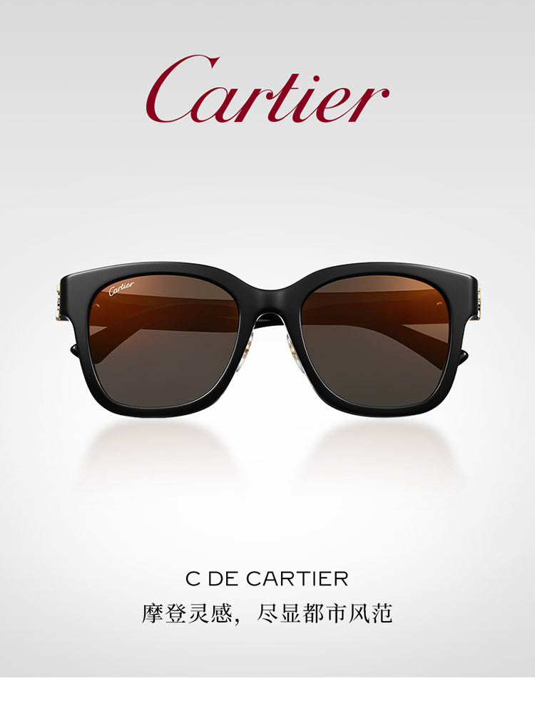 C de Cartier太阳眼镜,黑色醋酸纤维,镜腿抛光镀金饰面金属细节,方形片型,灰色镜片,带金色镜面效果。尺寸:54 x 20 x 145毫米。