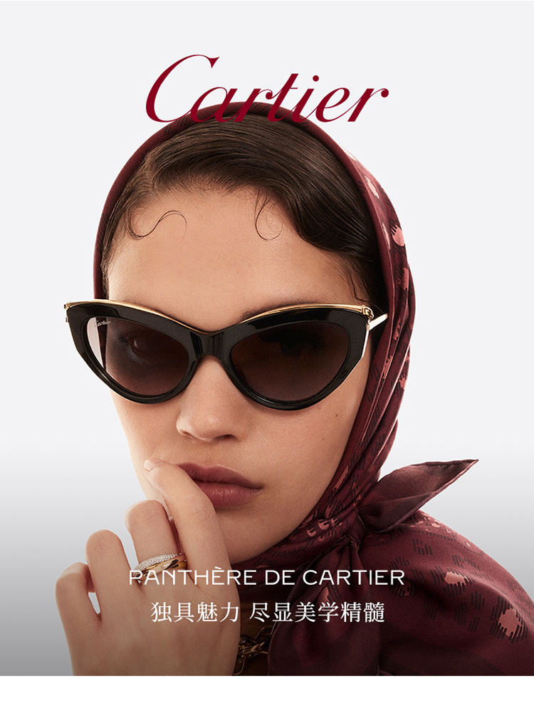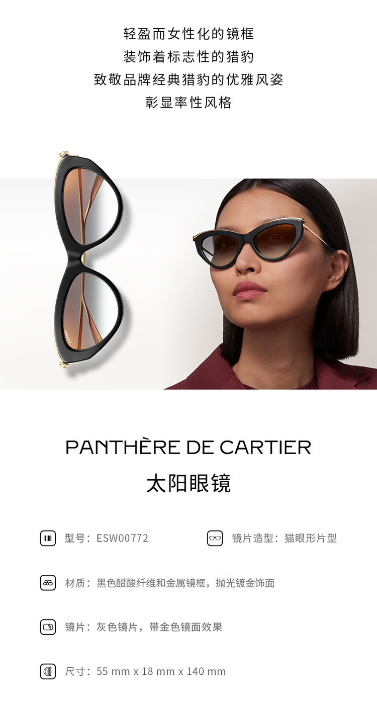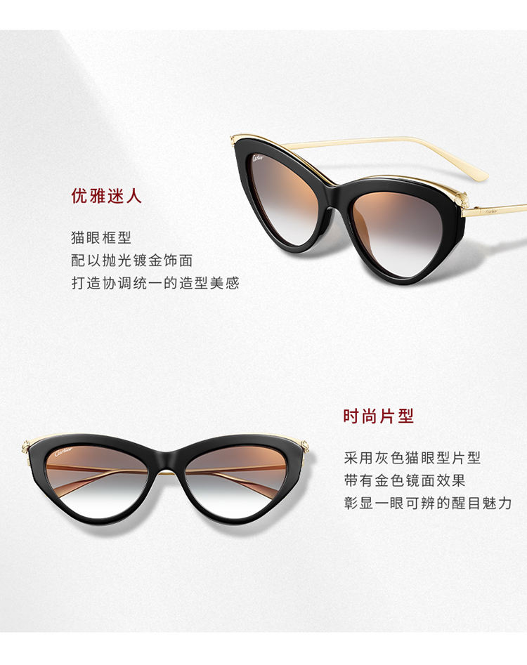 Panthère de Cartier太阳眼镜,黑色醋酸纤维和金属镜框,抛光镀金饰面,猫眼形片型,灰色镜片,带金色镜面效果。尺寸:55 x 18 x 140毫米。
