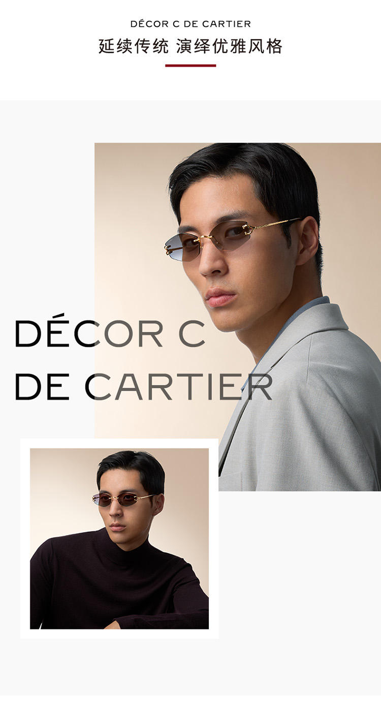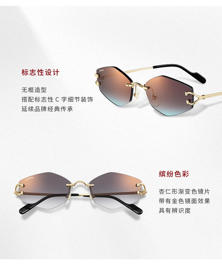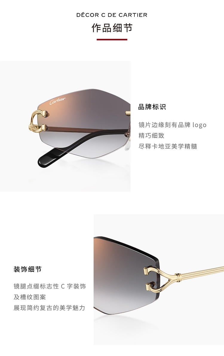 Décor太阳眼镜,饰以经典C de Cartier图案,无框金属镜架,抛光镀金饰面,杏仁形片型,渐变灰色镜片,带金色镜面效果。尺寸:56 x18 x140毫米。