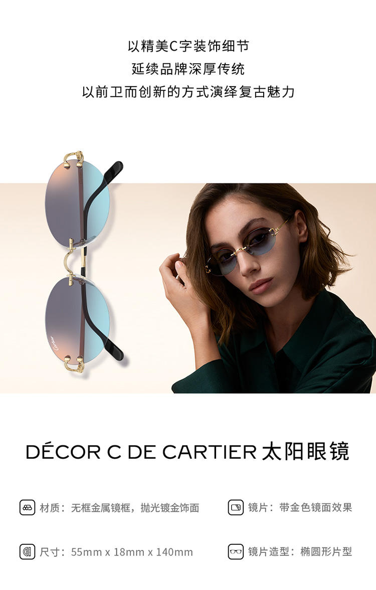 Décor太阳眼镜,饰以经典C de Cartier图案,无框金属镜架,抛光镀金饰面,椭圆形片型,渐变蓝色镜片,带金色镜面效果。尺寸:55 x18 x140毫米。