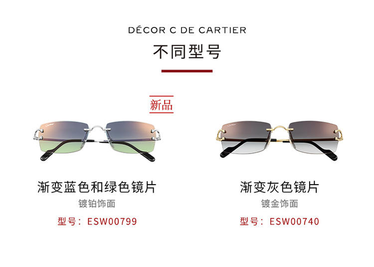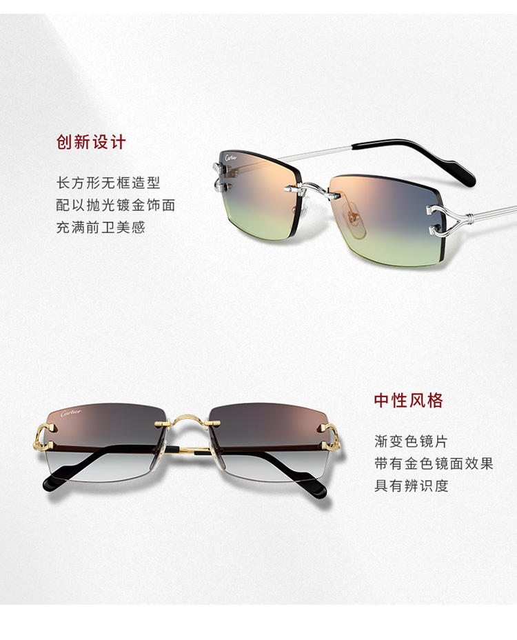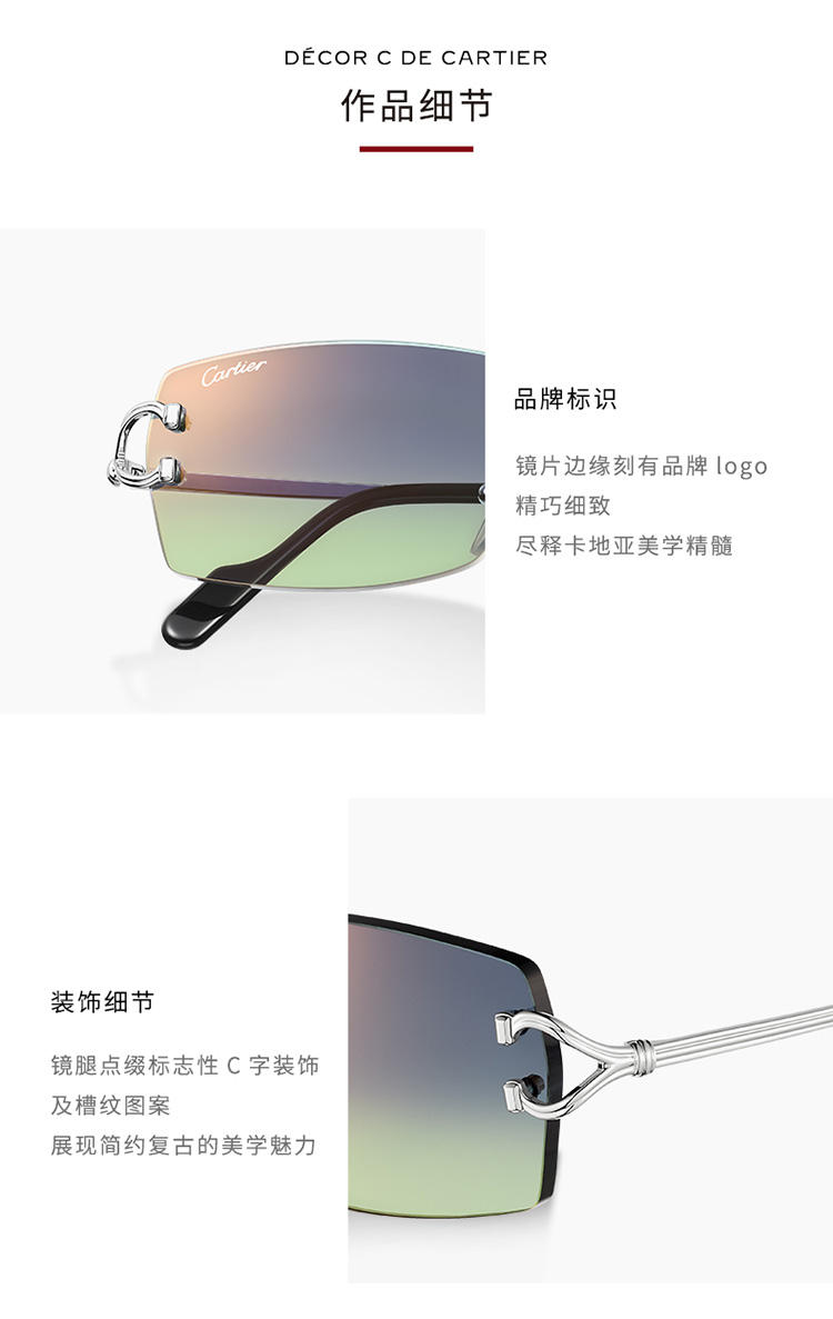 Décor太阳眼镜,饰以经典C de Cartier图案,无框金属镜架,抛光镀铂饰面,长方形片型,渐变蓝色和绿色镜片,带金色镜面效果。尺寸:56 x18 x140毫米。