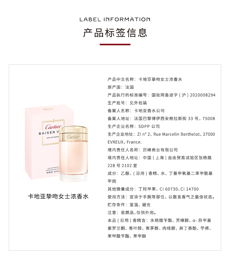 成分:ALCOHOL, PARFUM/FRAGRANCE, AQUA/WATER/EAU, BENZYL SALICYLATE, TETRAMETHYL ACETYLOCTAHYDRONAPHTHALENES, HEXAMETHYLINDANOPYRAN, BUTYL METHOXYDIBENZOYLMETHANE, LINALOOL, ALPHA-ISOMETHYL IONONE, HEXADECANOLACTONE, ACETYL CEDRENE, CITRUS AURANTIUM BERGAMIA (BERGAMOT) PEEL OIL, LIMONENE, CITRONELLOL, GERANIOL, EUCALYPTUS GLOBULUS OIL, PINENE, VANILLIN, BETA-CARYOPHYLLENE, GERANYL ACETATE, CINNAMYL ALCOHOL, ISOEUGENOL, ROSE FLOWER OIL/EXTRACT, BHT, LINALYL ACETATE, CAMPHOR, TERPINEOL, BENZYL BENZOATE, CI 14700 (RED 4), CI 60730 (EXT.VIOLET 2)