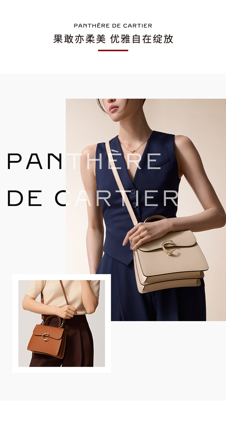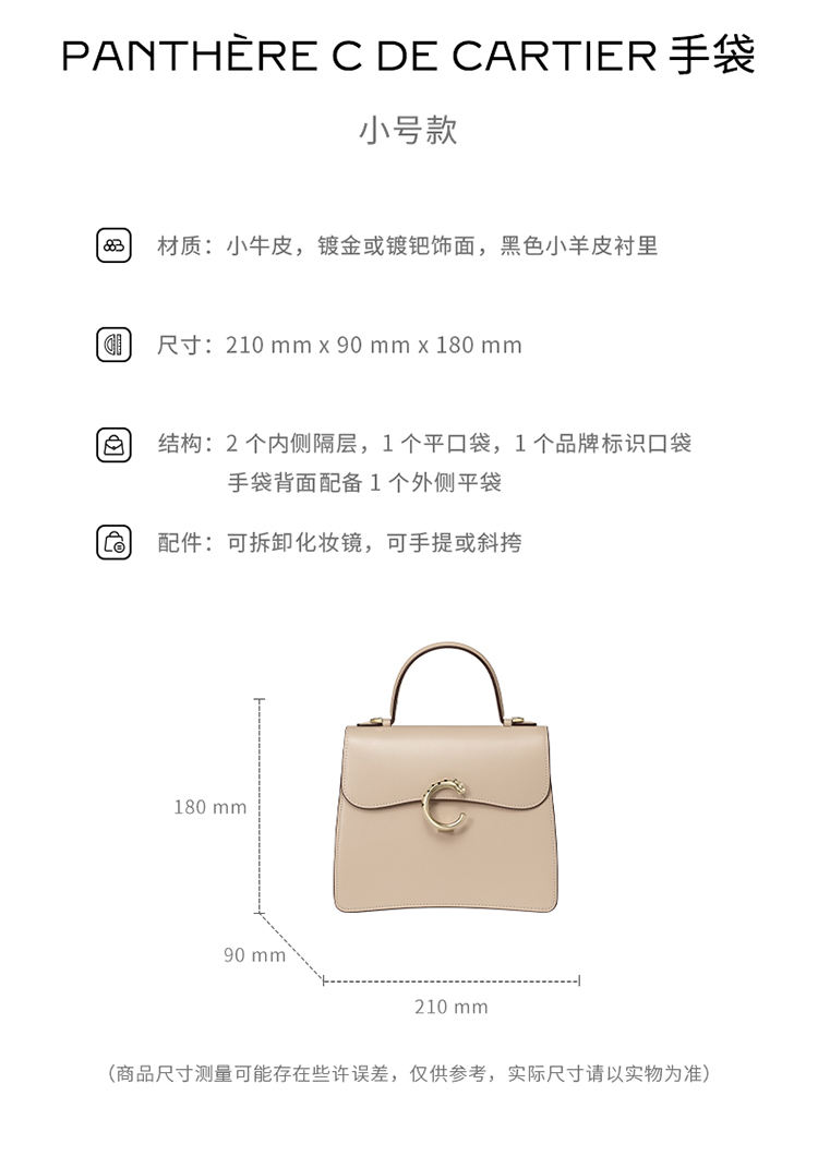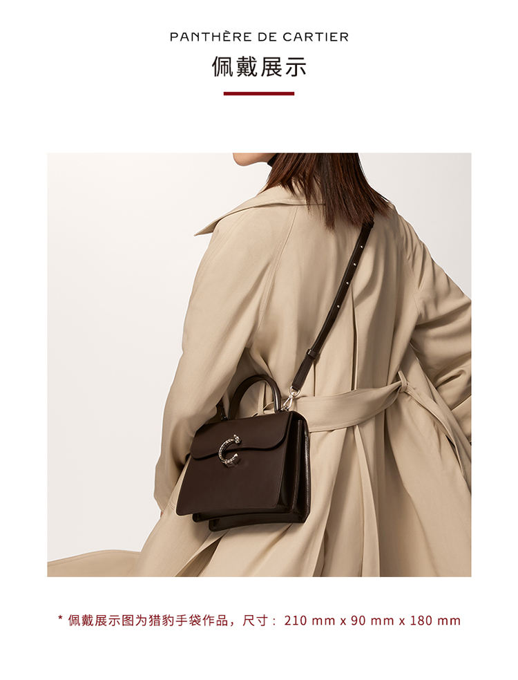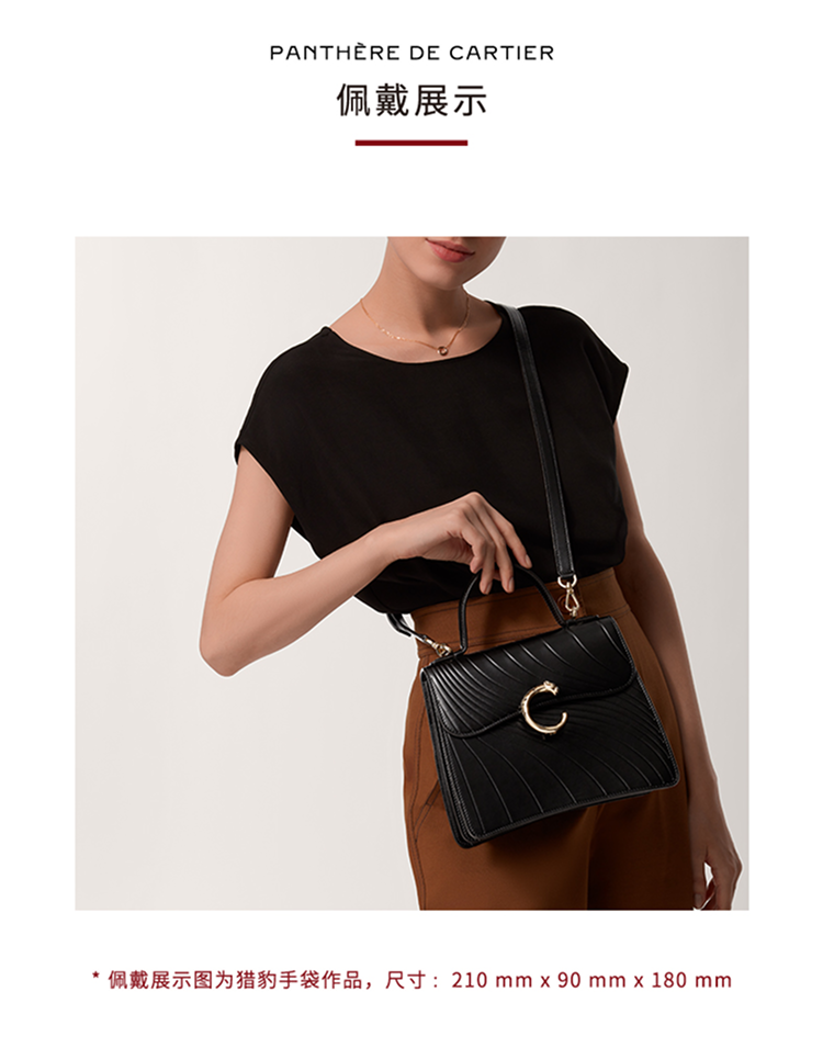 Panthère C de Cartier小号款手袋,黑色小牛皮,浮雕“Cartier”标识,镀金和黑色珐琅饰面包扣,内侧烫印金色“Cartier”标识。2个内侧隔层,1个平袋,1个品牌标识口袋,配可拆卸化妆镜。手袋背面设有1个外侧平袋。衬里:黑色小羊皮。尺寸:高180毫米 x 长210毫米 x 深90毫米。可手提或斜挎。