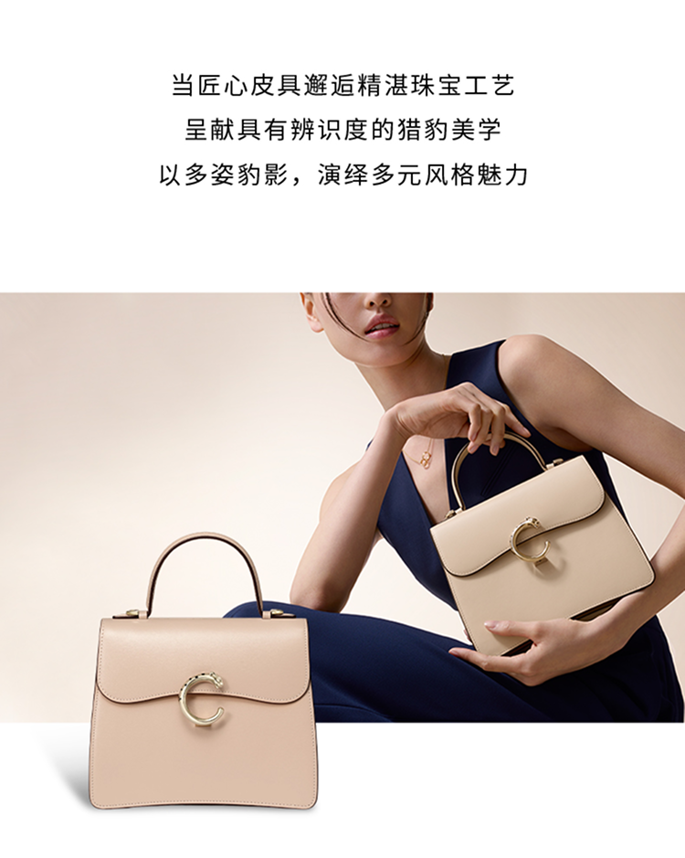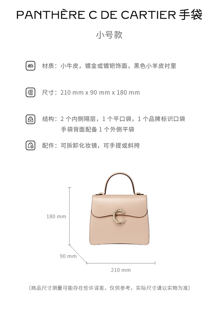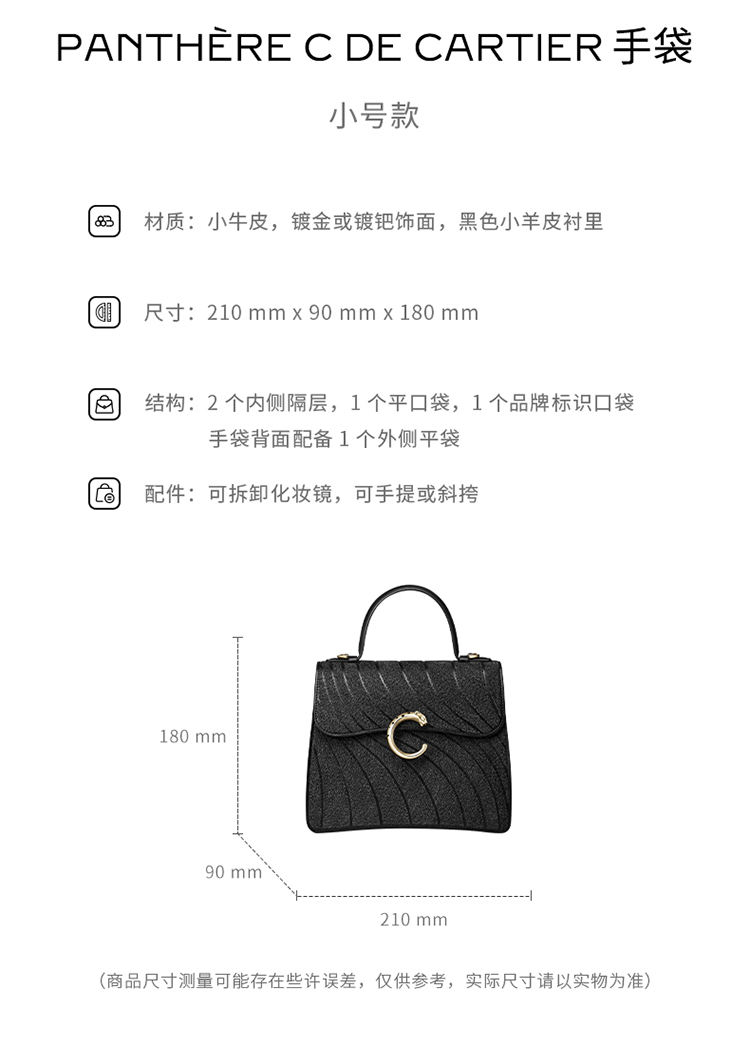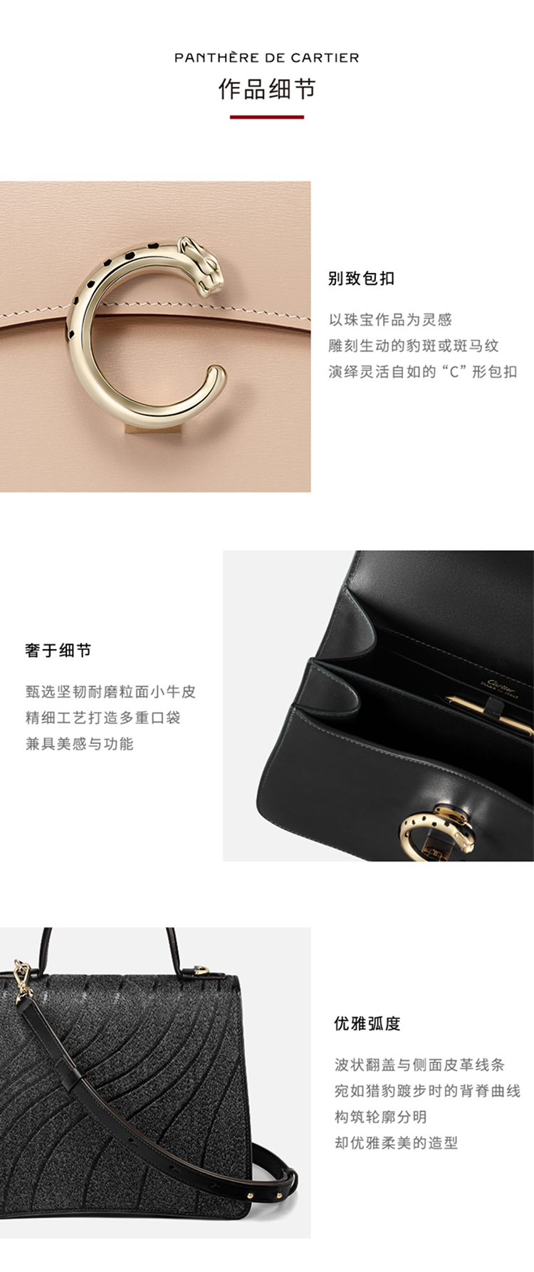 Panthère C de Cartier小号款手袋,香豆棕色粒纹小牛皮,镀钯饰面包扣,斑马纹图案,黑色珐琅,内侧烫印金色“Cartier”标识。2个内侧隔层,1个平袋,1个品牌标识口袋,配可拆卸化妆镜。手袋背面设有1个外侧平袋。衬里:黑色小羊皮。尺寸:高180毫米 x 长210毫米 x 深90毫米。可手提或斜挎。