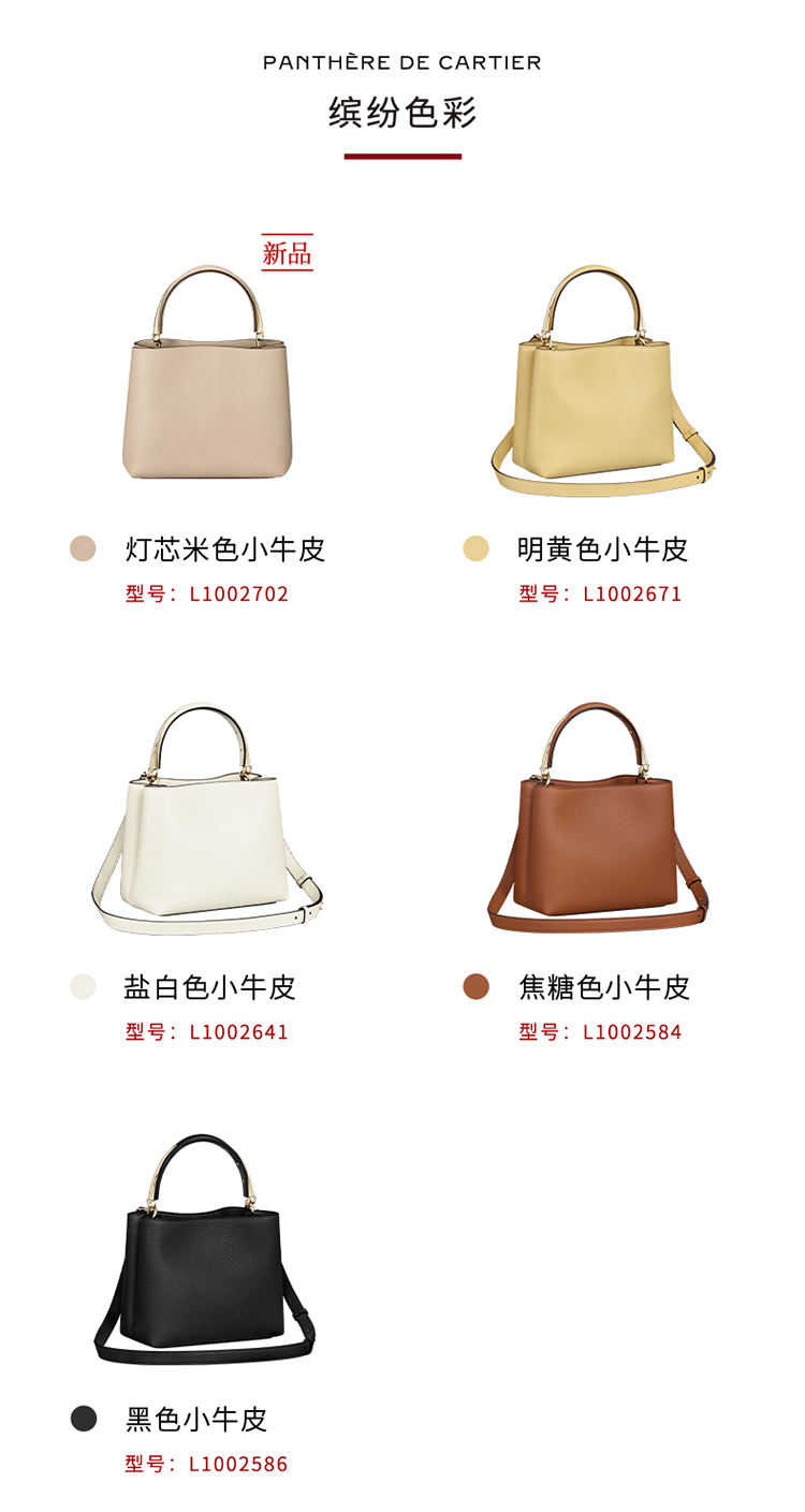 小号款手袋,黑色粒面小牛皮,镀金饰面猎豹图案提手,内侧烫印金色“Cartier”标识。1个内侧隔层,1个内侧平袋,1个同色系粒面小牛皮可拆卸拉链口袋。迷你皮革翻盖磁吸包扣。黑色粒面小牛皮可调节及可拆卸肩带。4枚金属护脚。衬里:黑色小羊皮。尺寸:高240毫米 x 长190毫米 x 深110毫米。可手提或斜挎。