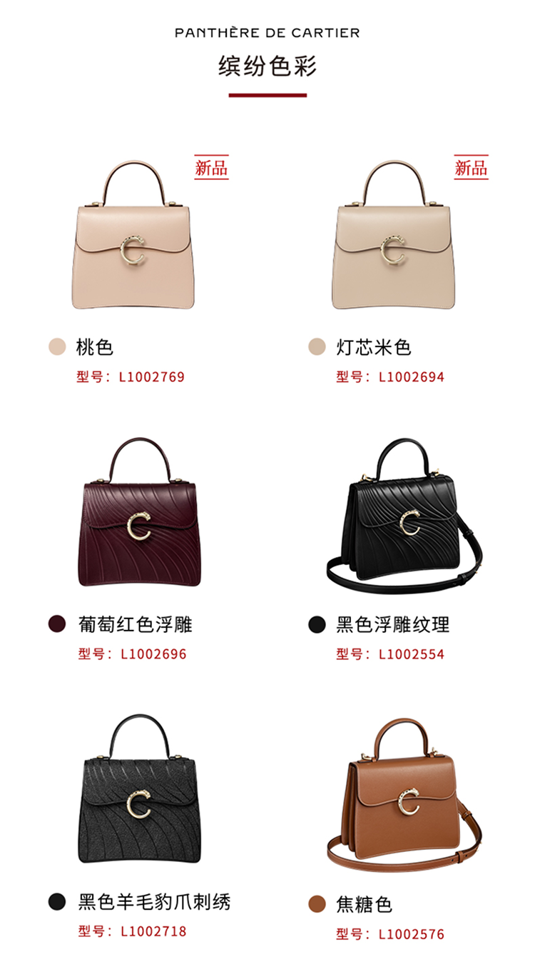 Panthère C de Cartier小号款手袋,粘土色小牛皮,镀金和黑色珐琅饰面包扣,内侧烫印金色“Cartier”标识。2个内侧隔层,1个平袋,1个品牌标识口袋,配可拆卸化妆镜。手袋背面设有1个外侧平袋。衬里:黑色小羊皮。尺寸:高180毫米 x 长210毫米 x 深90毫米。可手提或斜挎。