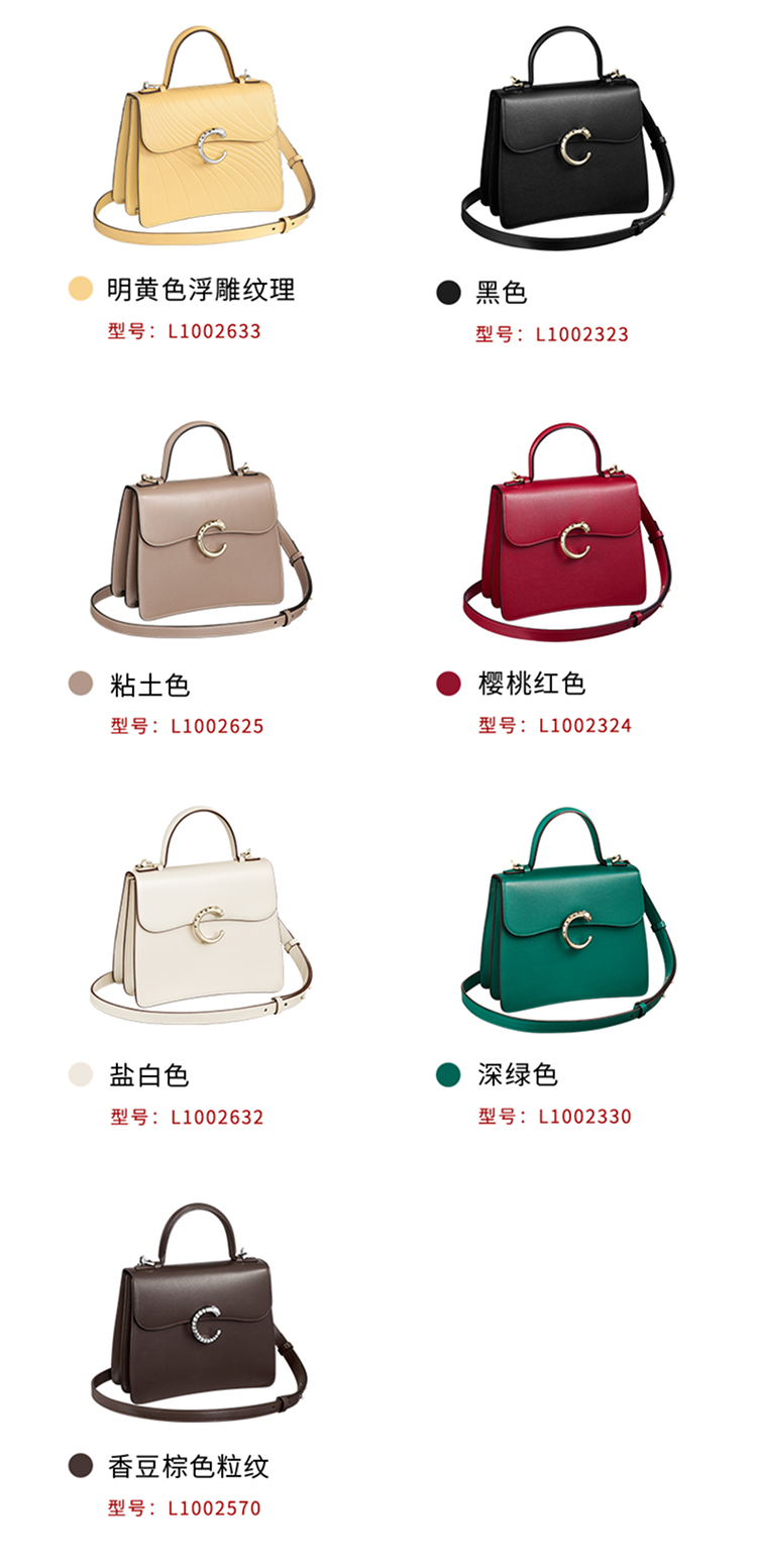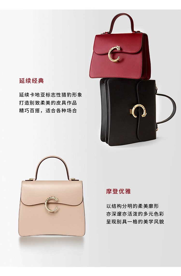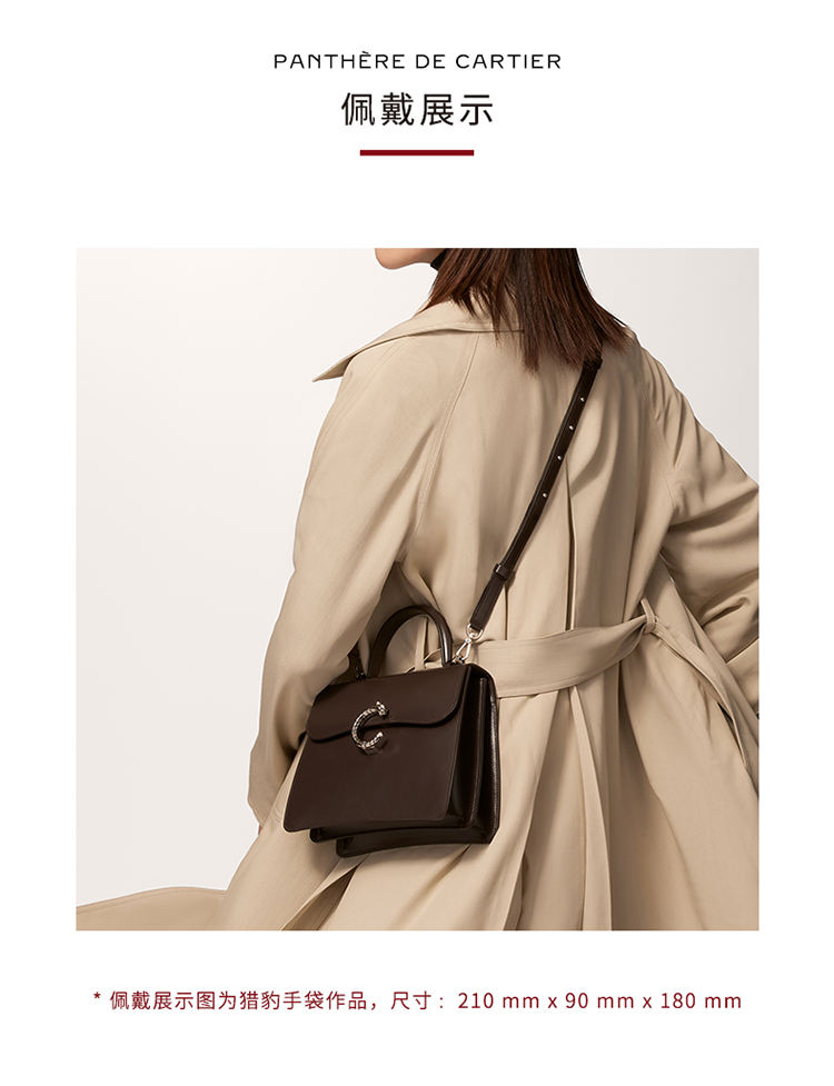 Panthère C de Cartier小号款手袋,明黄色小牛皮,浮雕“Cartier”标识,镀钯和黑色珐琅饰面包扣,内侧烫印银色“Cartier”标识。2个内侧隔层,1个平袋,1个标识口袋,配可拆卸化妆镜。手袋背面设有1个外侧平袋。衬里:黑色小羊皮。尺寸:高180毫米 x 长210毫米 x 深90毫米。可手提或斜挎。