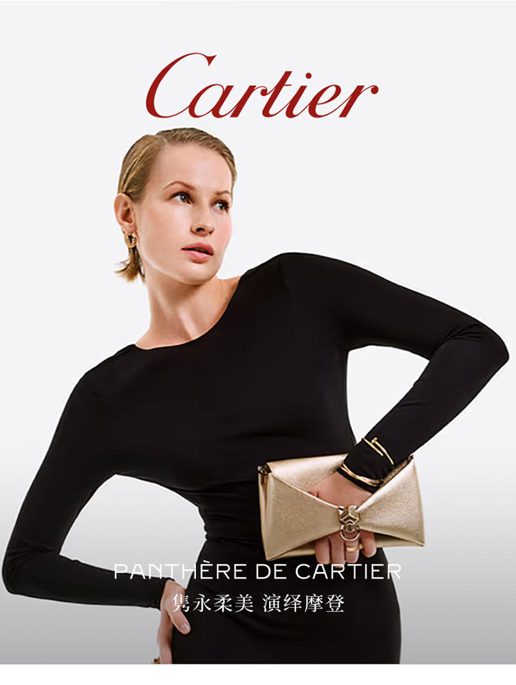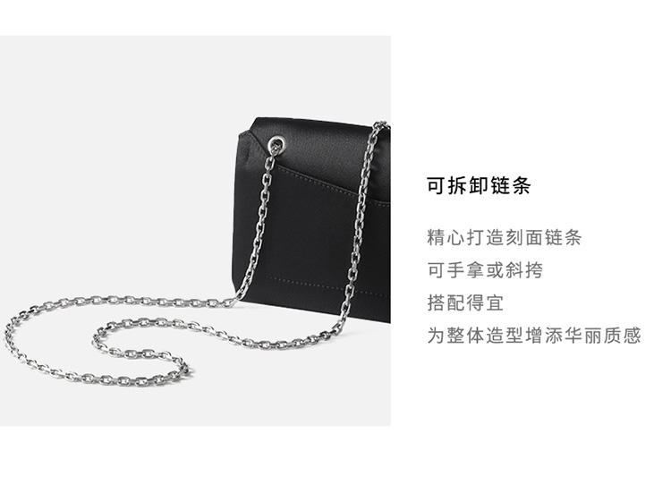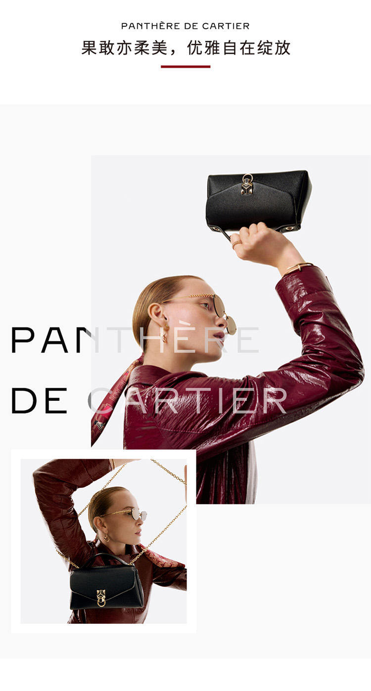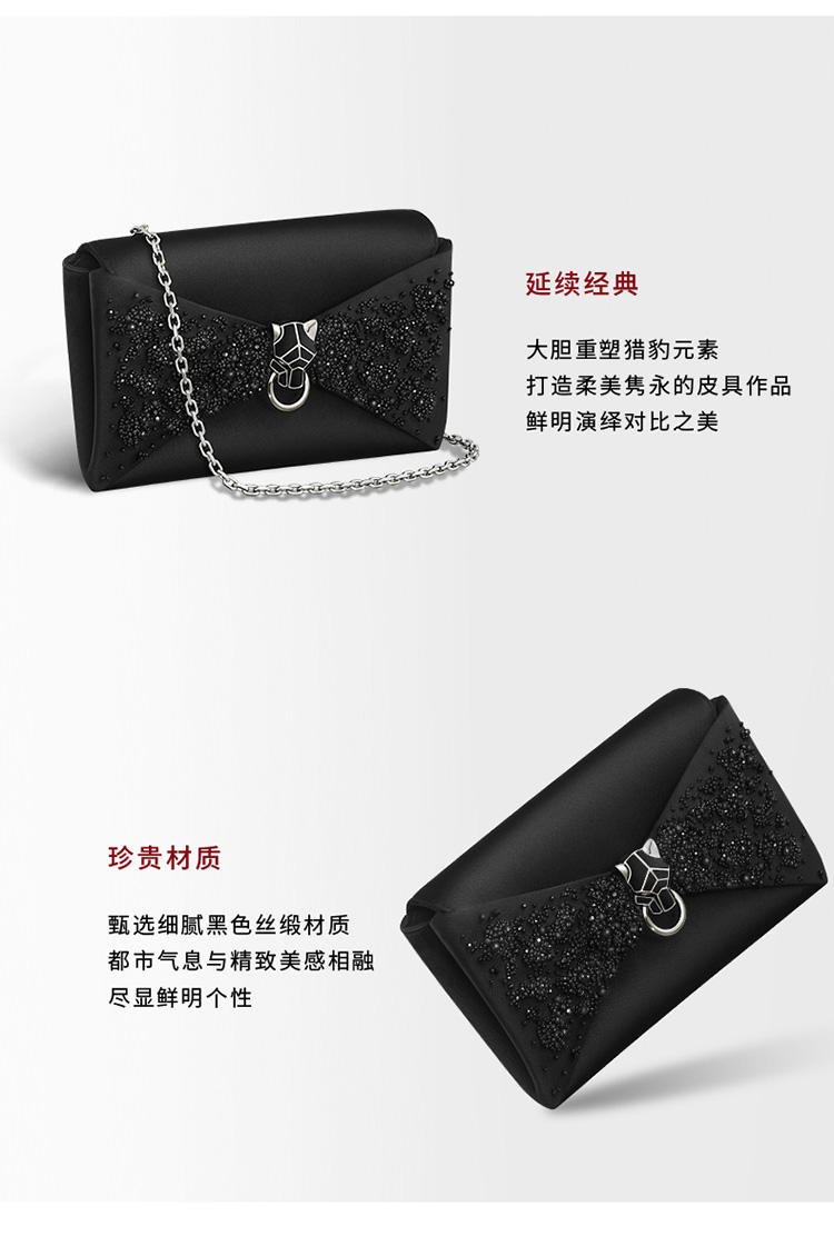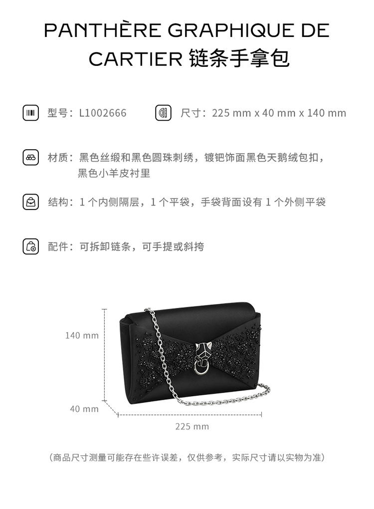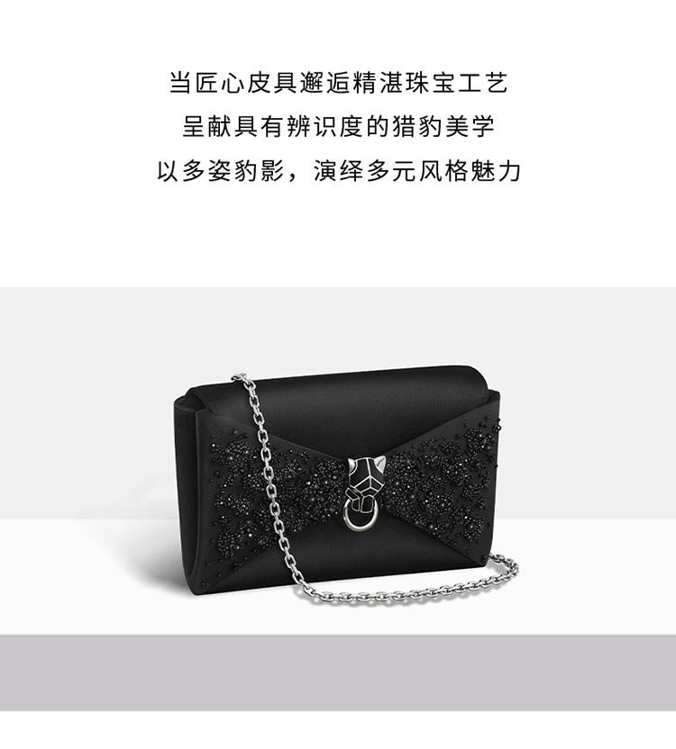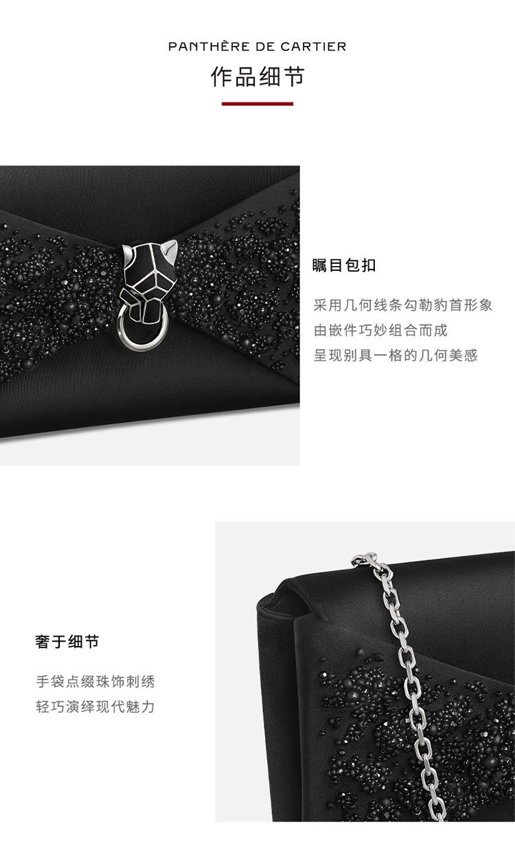 Panthère de Cartier链条手拿包,黑色丝缎和黑色圆珠刺绣,镀钯饰面黑色天鹅绒包扣嵌件,内侧烫印银色“Cartier”标识。1个内侧隔层,1个平袋。手袋背面设有1个外侧平袋。衬里:黑色小羊皮。可拆卸链条。尺寸:高140毫米 x 长225毫米 x 深40毫米。可手提或斜挎。