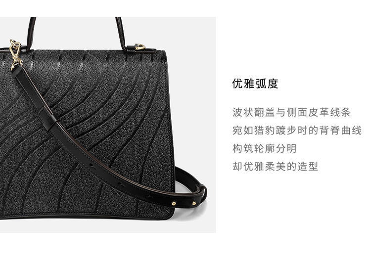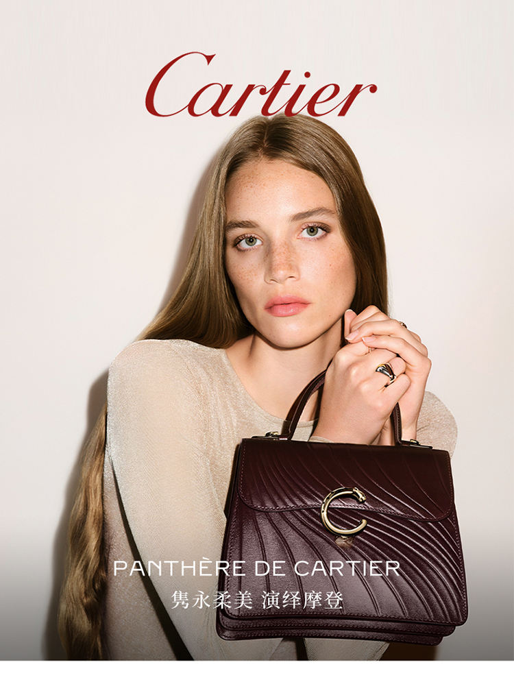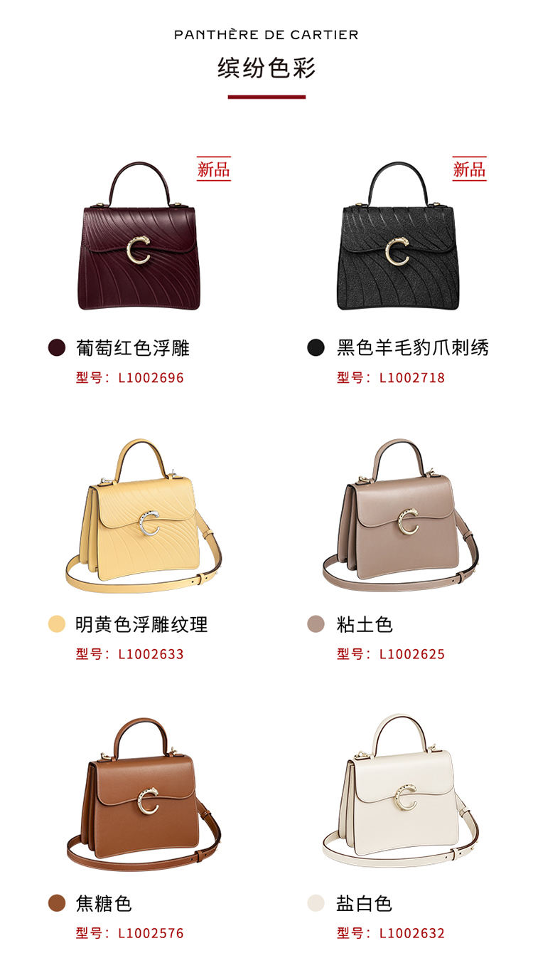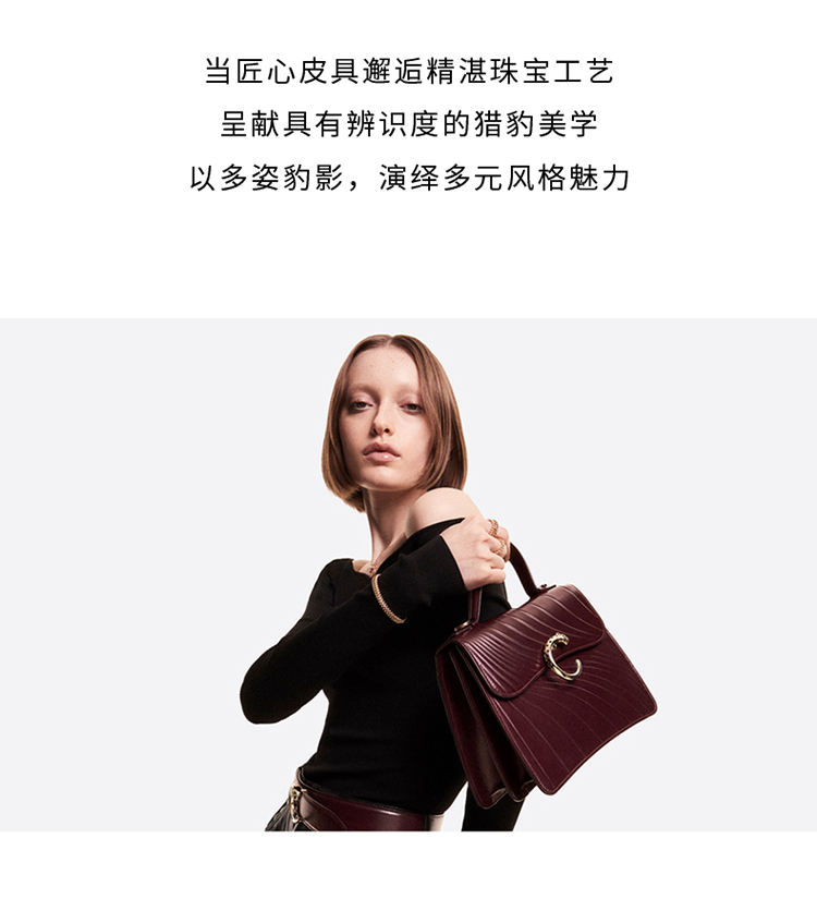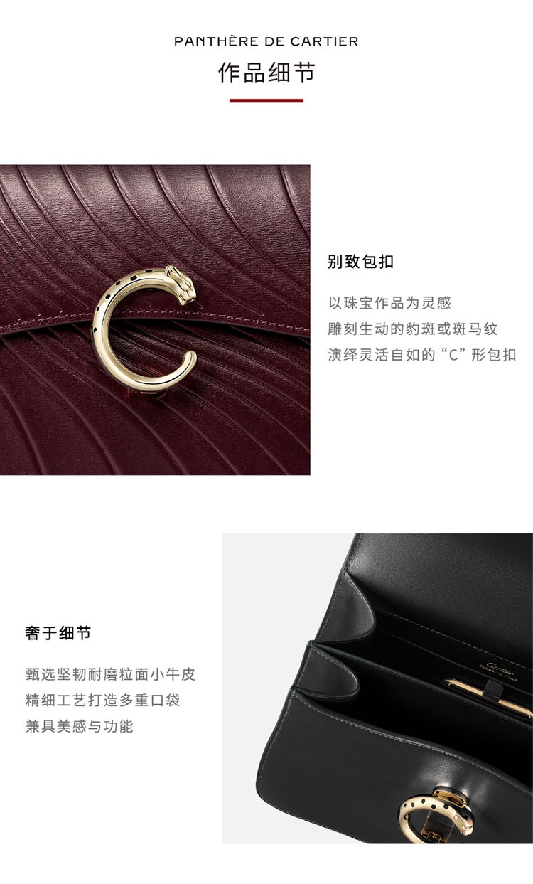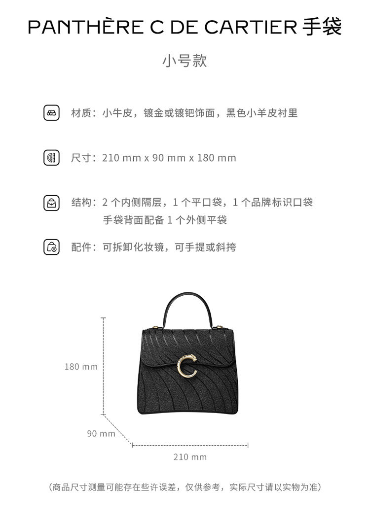 Panthère C de Cartier小号款手袋,黑色粒纹小牛皮,饰有羊毛豹爪刺绣图案,镀金和黑色珐琅饰面包扣,内侧烫印金色“Cartier”标识。2个内侧隔层,1个平袋,1个标识口袋,配可拆卸化妆镜。手袋背面设有1个外侧平袋。衬里:黑色小羊皮。尺寸:高度:180毫米。长度:210毫米。深度:90毫米。可手提或斜挎。
