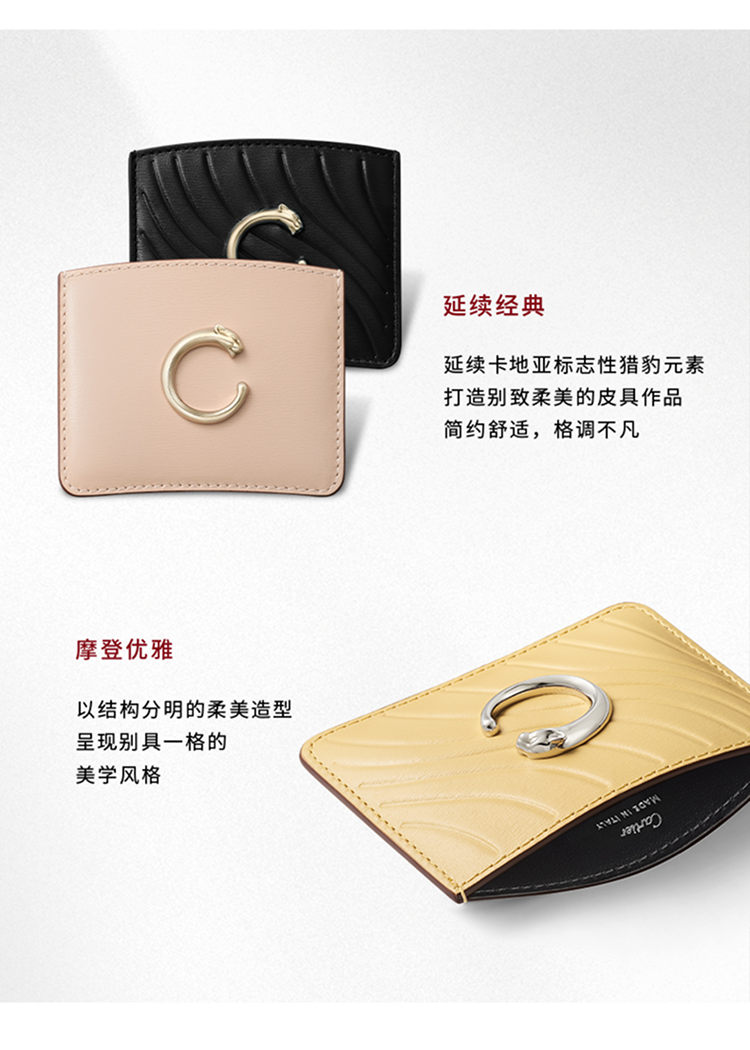 Panthère C de Cartier单层卡片夹,樱桃红色小牛皮,镀金饰面Panthère猎豹标识。内部:黑色小羊皮,1个大号中央卡袋,背面设有3个卡袋,烫印金色“Cartier”标识。