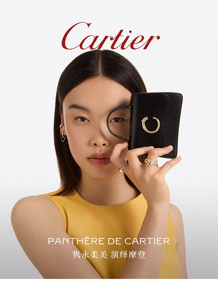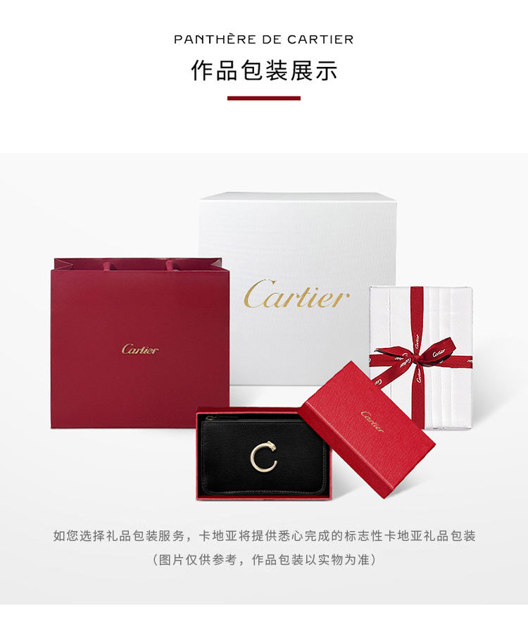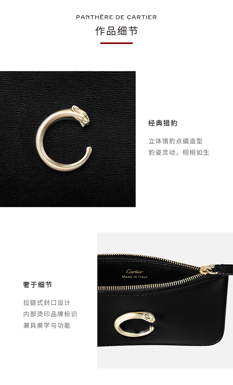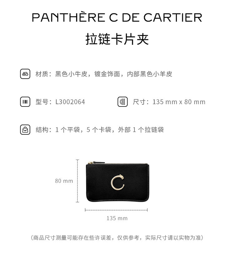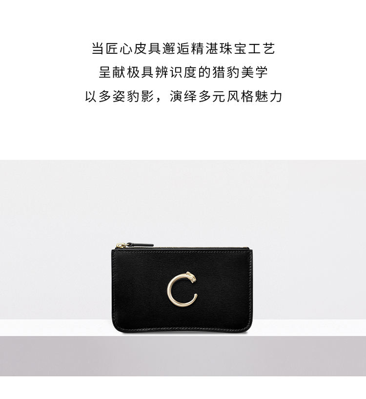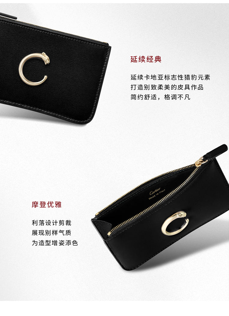Panthère C de Cartier拉链卡片夹,黑色小牛皮,镀金饰面Panthère猎豹标识。外部:1个拉链袋。内部:黑色小羊皮,1个平袋,5个卡袋,烫印金色“Cartier”标识。尺寸:高80毫米 x 宽135毫米