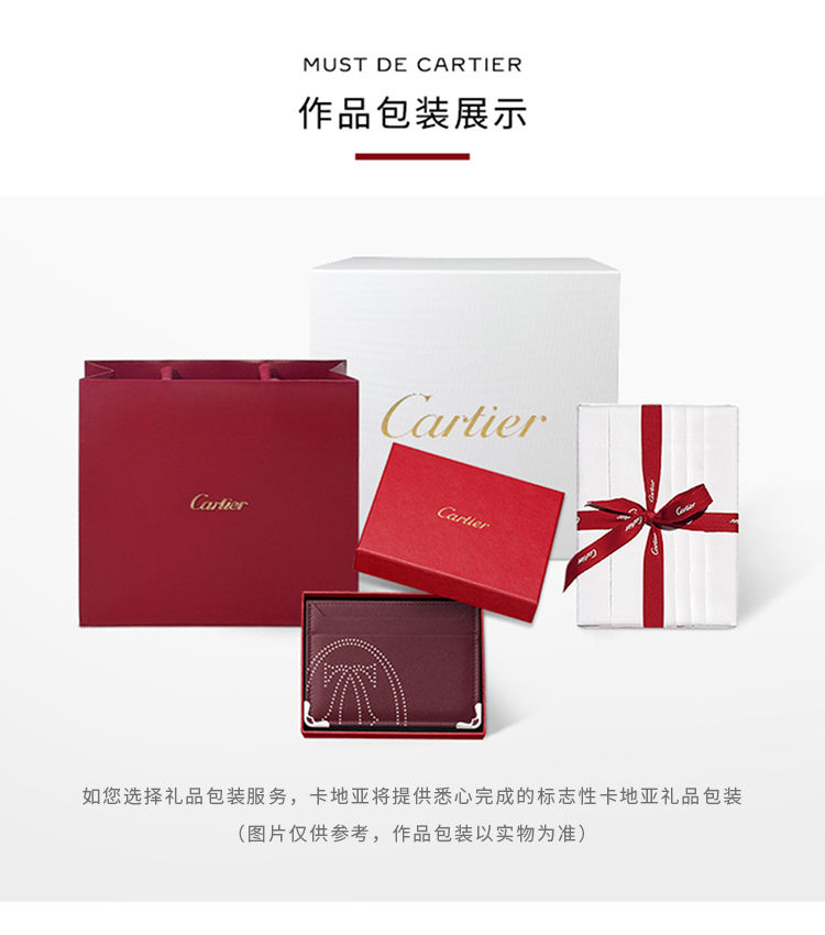 Must de Cartier双层卡片夹,酒红色小牛皮,饰以超大号圆点标识印花。外部:浮雕双C标识,镀钯饰面金属包角。内部:黑色小牛皮,银色“Cartier”标识,正面带2个信用卡平袋,背面带2个口袋,中央口袋。尺寸:高75毫米 x 宽105毫米。