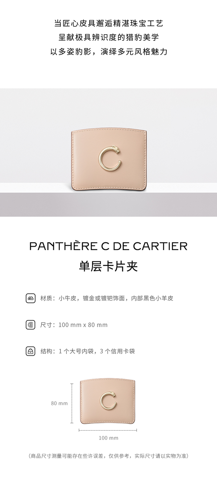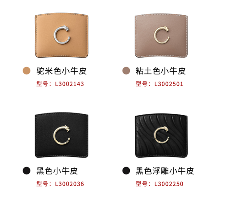 Panthère C de Cartier单层卡片夹,粘土色小牛皮,镀金饰面Panthère猎豹标识。内部:黑色小羊皮,1个大号中央卡袋,背面设有3个信用卡袋,烫印金色“Cartier”标识。
