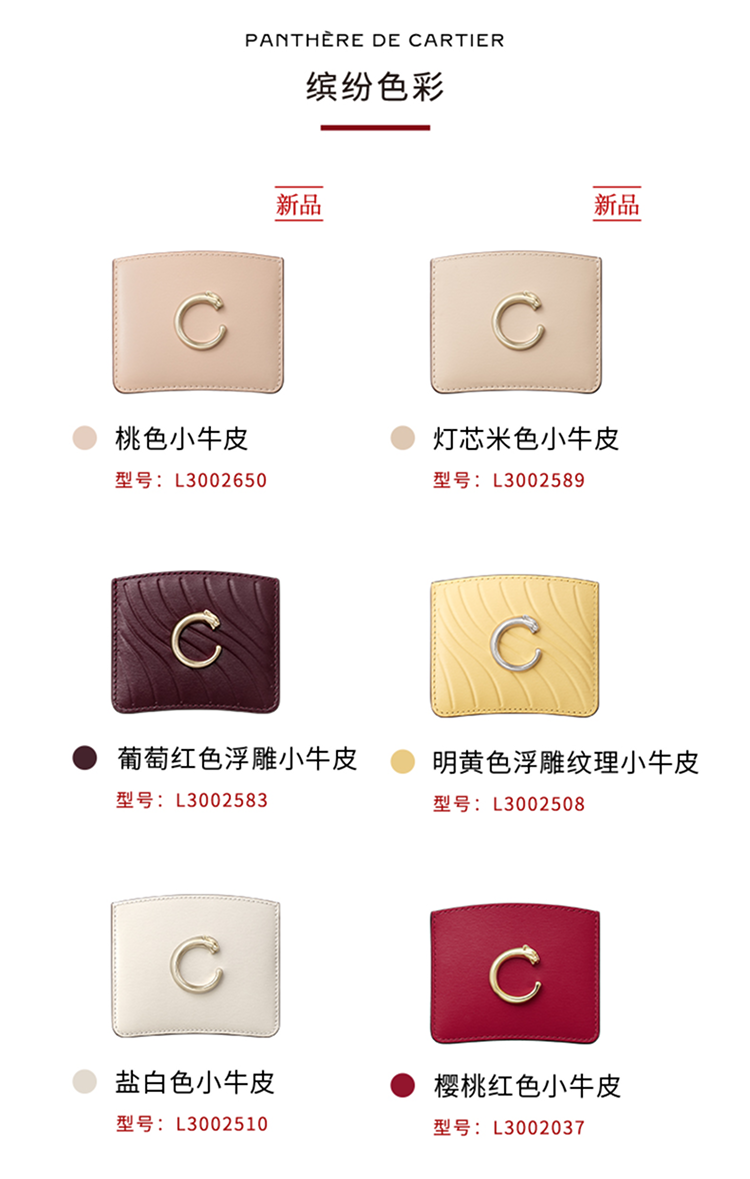 Panthère C de Cartier单层卡片夹,明黄色小牛皮,浮雕“Cartier”标识,镀钯饰面Panthère猎豹标识。内部:黑色小羊皮,1个大号中央卡袋,背面设有3个信用卡袋,烫印银色“Cartier”标识。