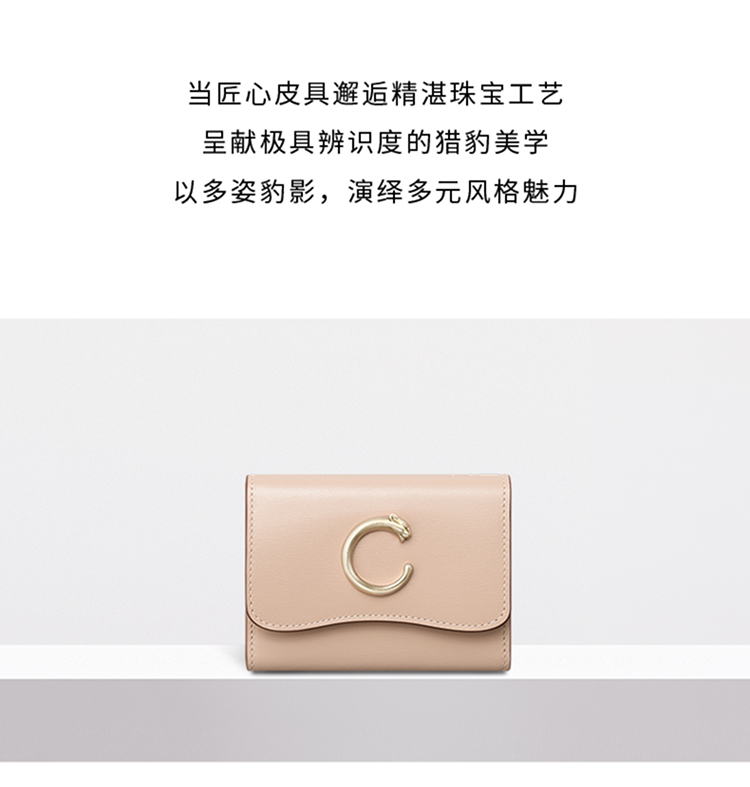Panthère C de Cartier迷你皮夹,盐白色小牛皮,镀金饰面“Cartier”标识。内部:黑色小羊皮,1个接裆式口袋,4个信用卡袋,1个拉链袋,1个平袋,烫印金色“Cartier”标识。尺寸:宽110毫米 x 高85毫米。