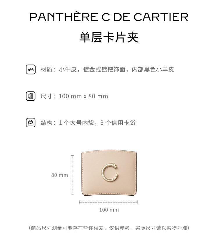 Panthère C de Cartier单层卡片夹,灯芯米色小牛皮,镀金饰面Panthère猎豹标识。内部:黑色小羊皮,1个大号中央卡袋,背面设有3个信用卡袋,烫印金色“Cartier”标识。 尺寸:宽度:100毫米。高度:80毫米。
