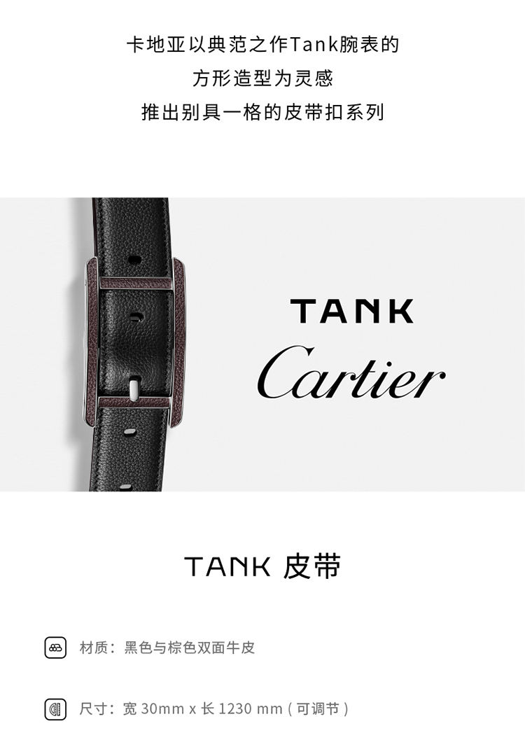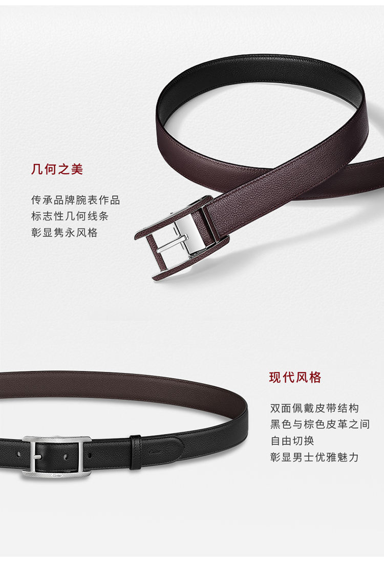 皮带,镀钯饰面皮带扣,饰有槽纹图案,“Cartier”标志。黑色和棕色粒纹牛皮双面皮带,浮雕“Cartier”标志。尺寸:宽度:30毫米。长度:1230毫米。可调节。