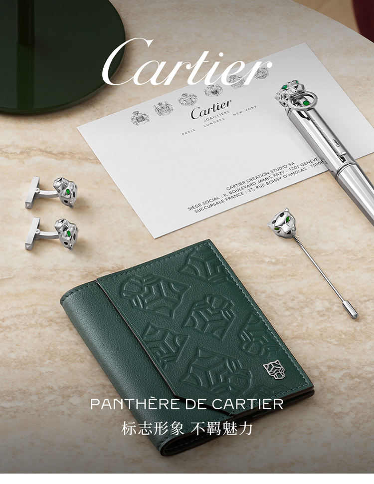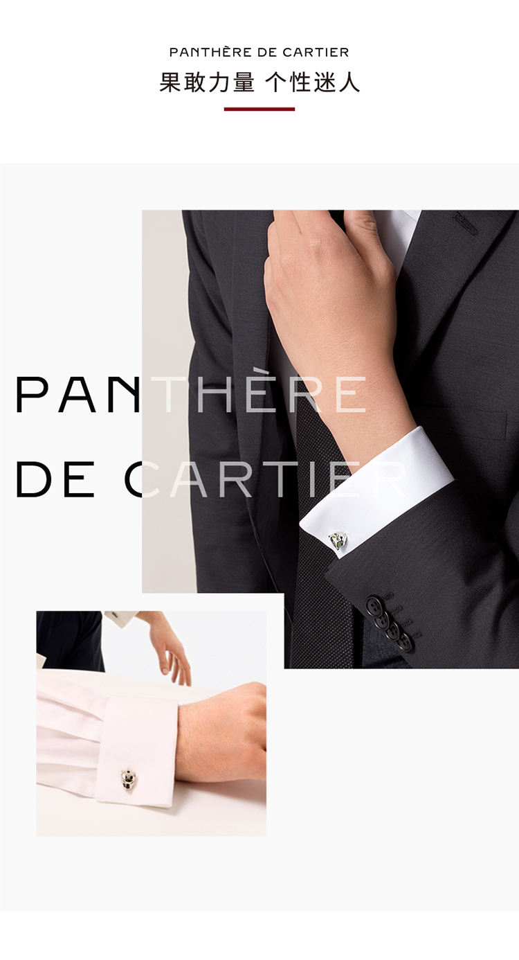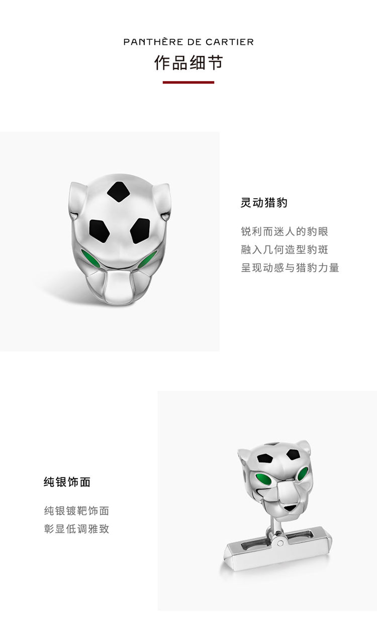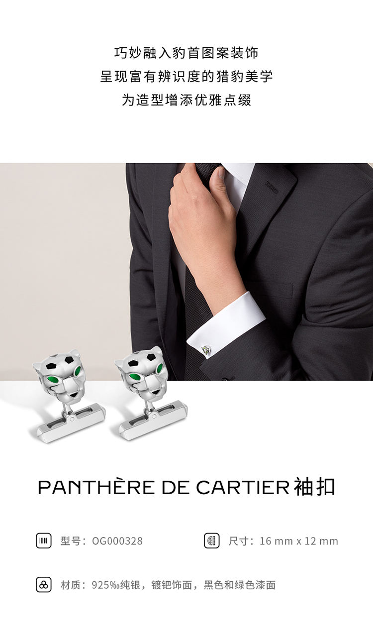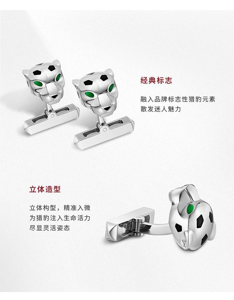 豹首图案袖扣,925‰纯银镀钯饰面与黑色和绿色漆面。尺寸:长16毫米 x 宽12毫米.