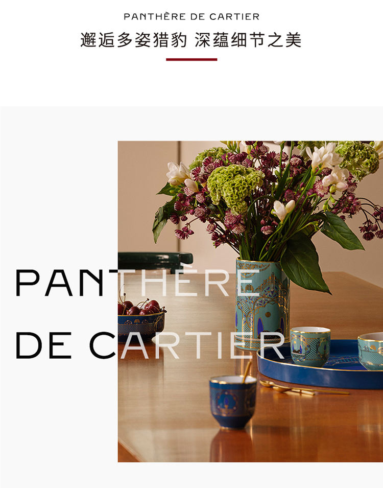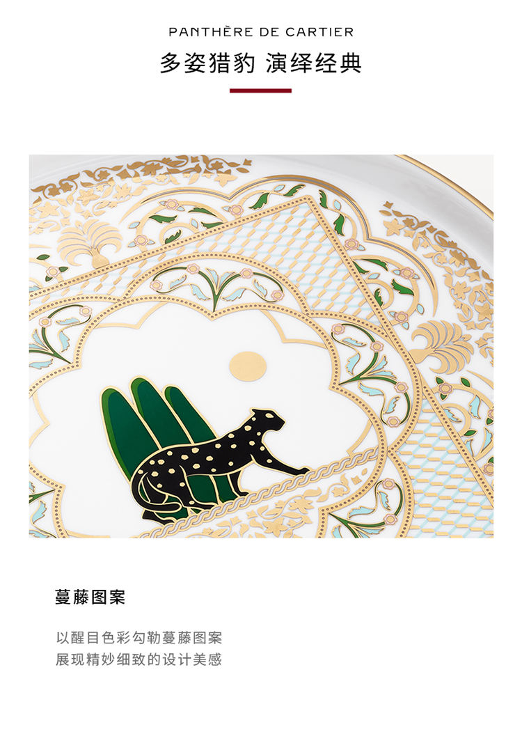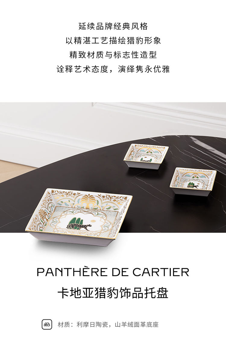 Panthère de Cartier卡地亚猎豹饰品托盘,中号款,利摩日陶瓷,蔓藤图案,山羊麂皮底座。尺寸:宽17厘米 x 长17厘米 x 高3厘米