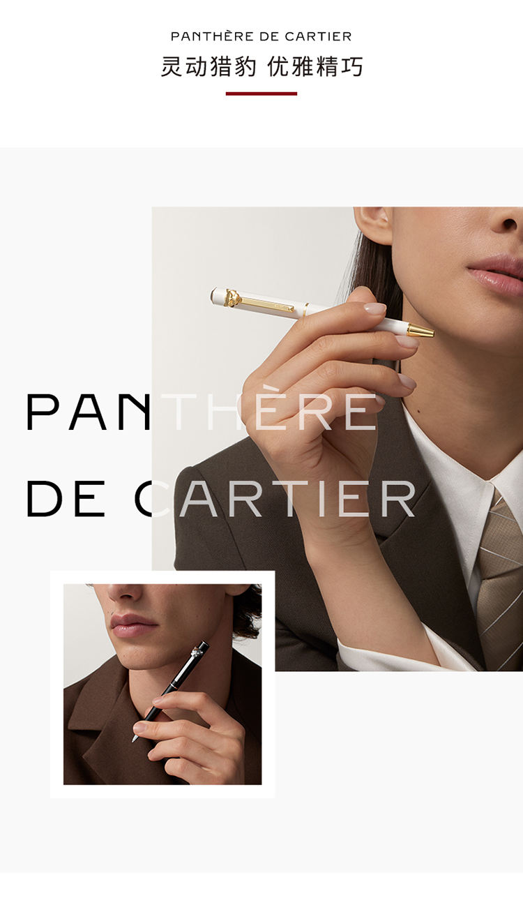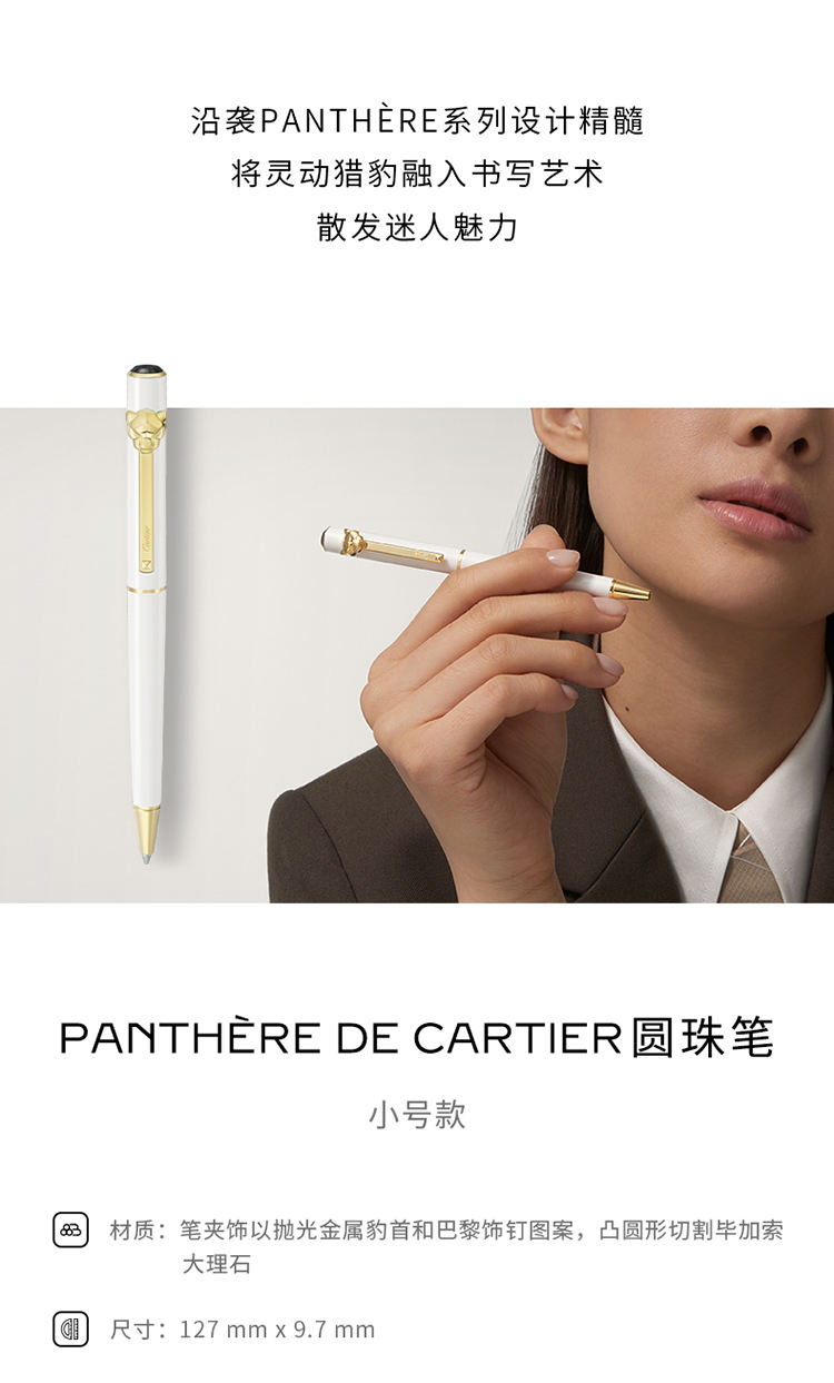 Panthère de Cartier圆珠笔,小号款。笔杆和笔帽采用拉丝饰面金属,笔夹饰以抛光金属豹首和巴黎饰钉图案,镀钯饰面细节。凸圆形切割毕加索大理石。