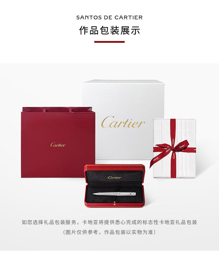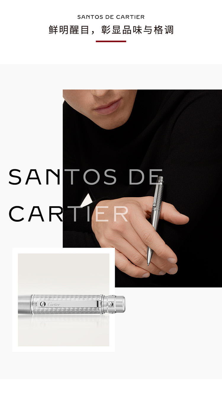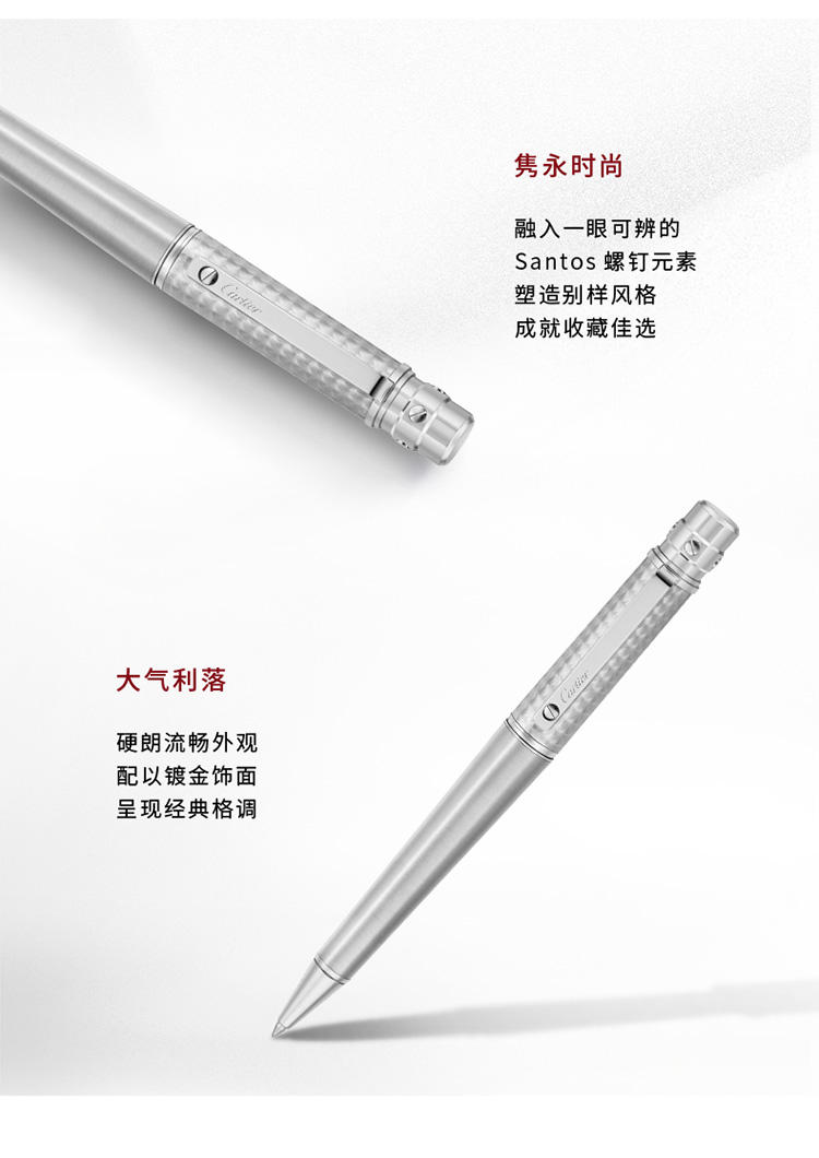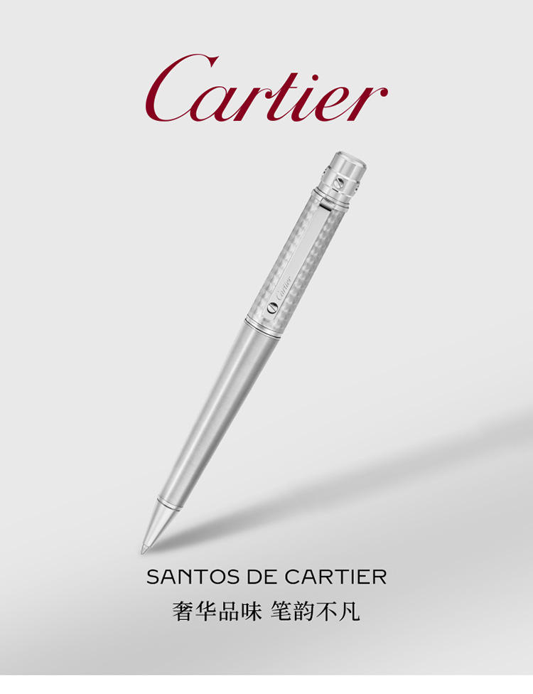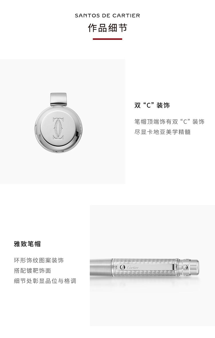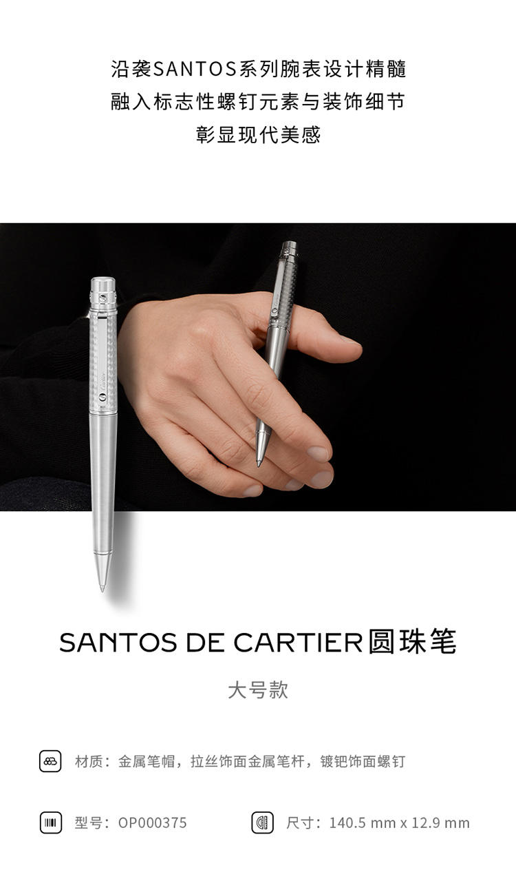 Santos de Cartier圆珠笔,大号款,金属笔帽,环形饰纹图案和拉丝饰面金属笔杆,镀钯饰面螺钉和装饰细节。