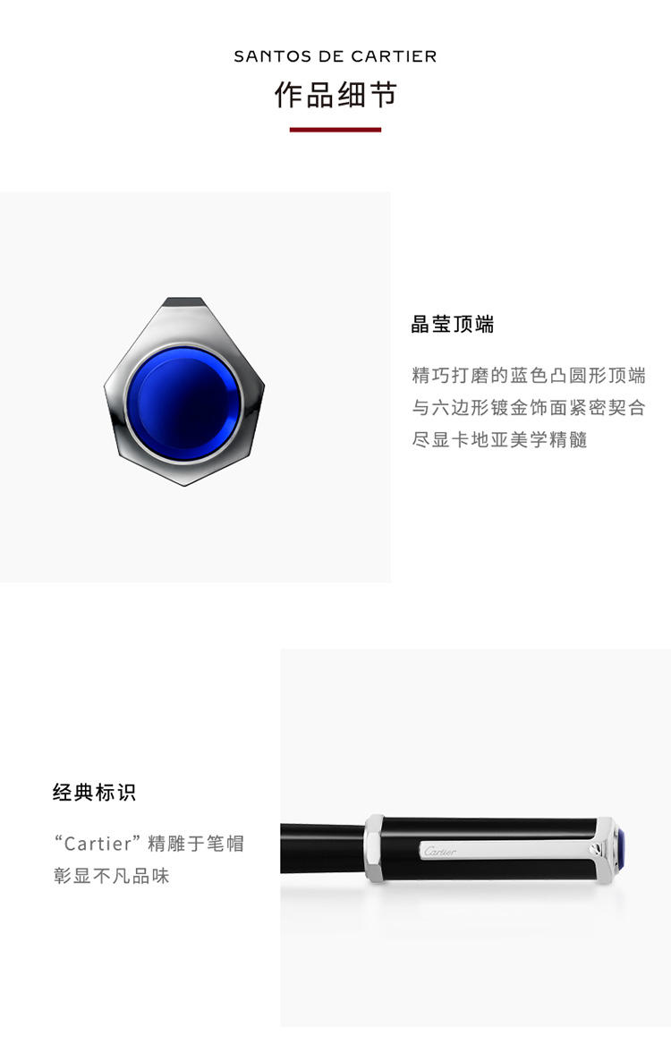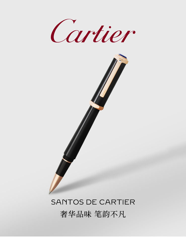 Santos-Dumont滚珠笔,黑色复合材质笔杆和笔帽,镀玫瑰金饰面细节,蓝色凸圆形树脂。