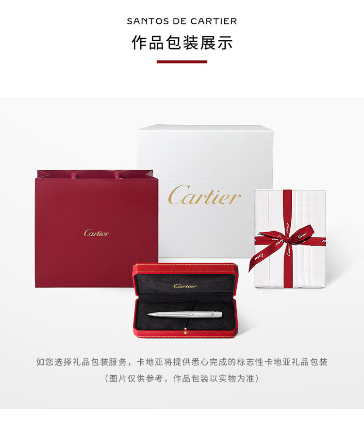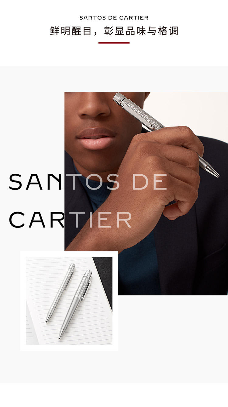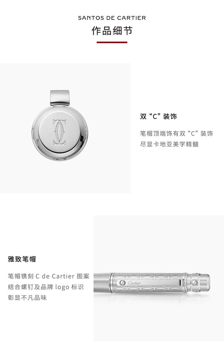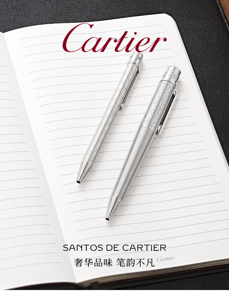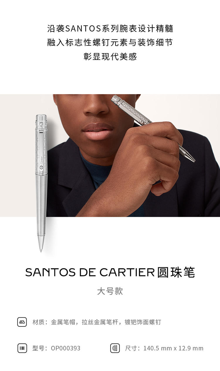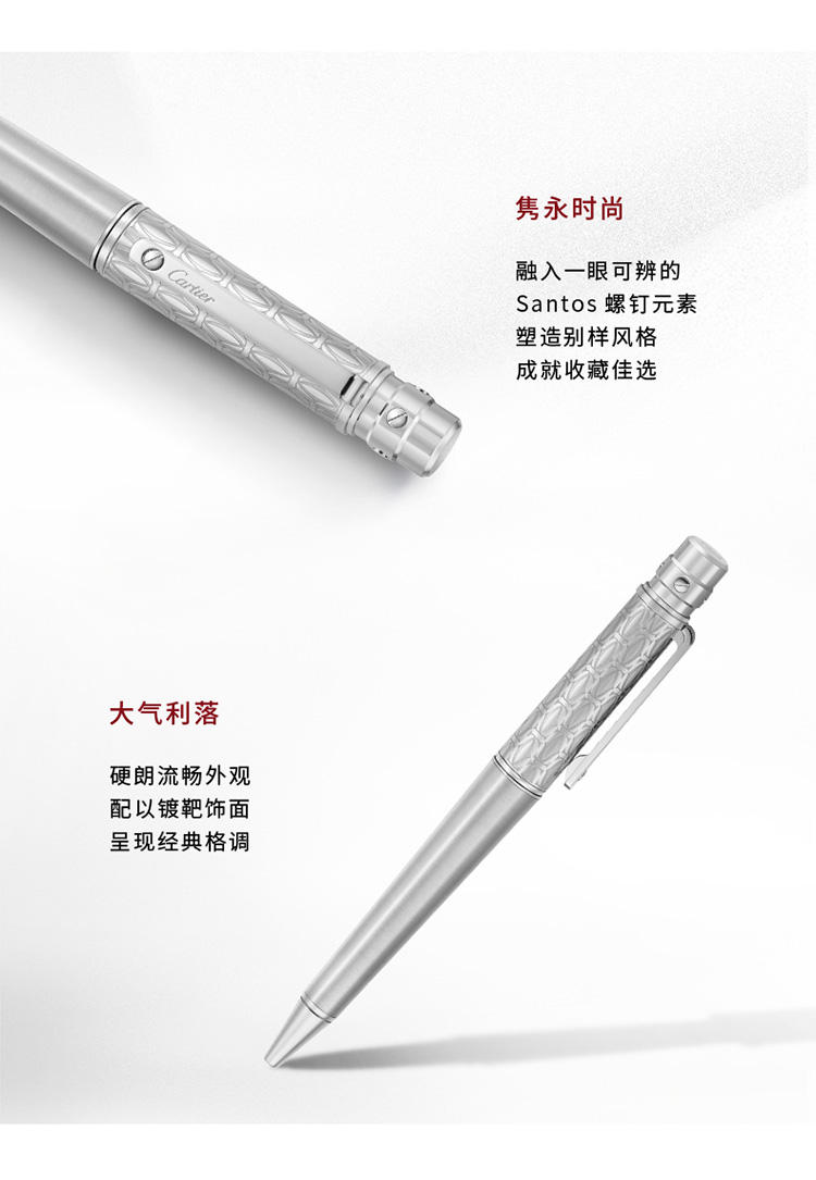 Santos de Cartier圆珠笔,大号款,金属笔帽镌刻C de Cartier图案,拉丝金属笔杆,镀钯饰面螺钉和装饰细节。