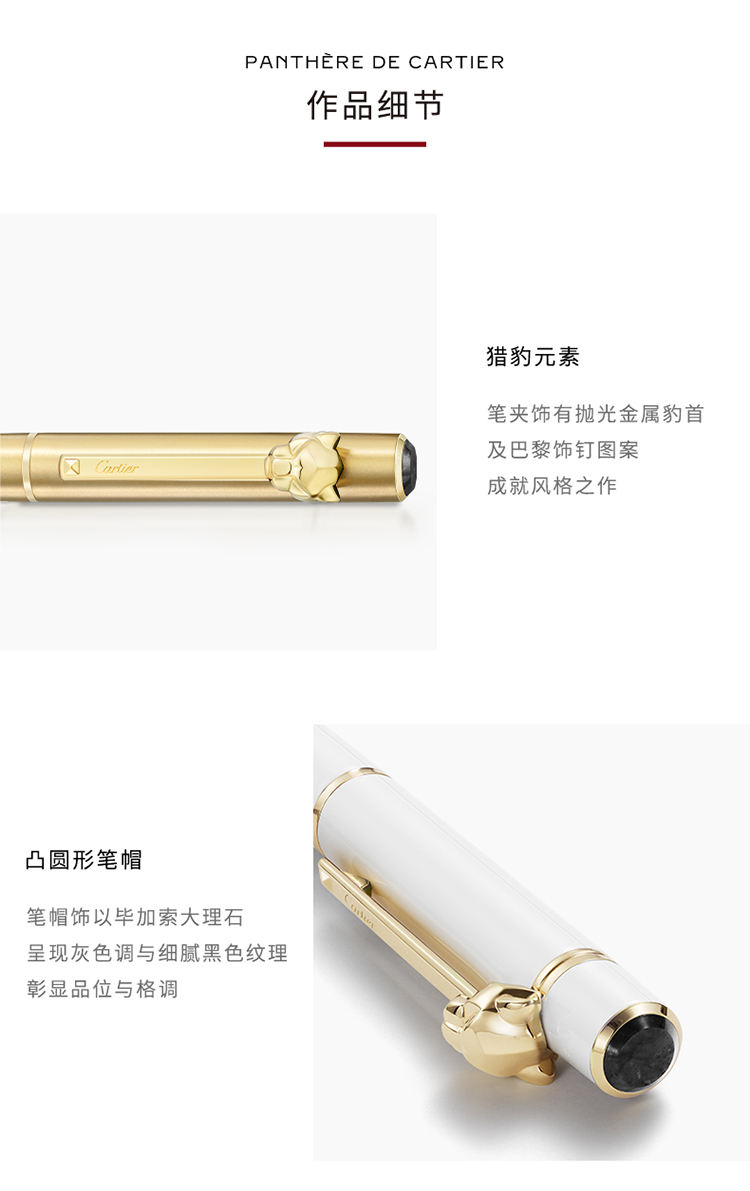 Panthère de Cartier圆珠笔,小号款。笔杆和笔帽覆以酒红色亮漆,笔夹饰以抛光金属豹首和巴黎饰钉图案,镀金饰面细节。凸圆形切割毕加索大理石。