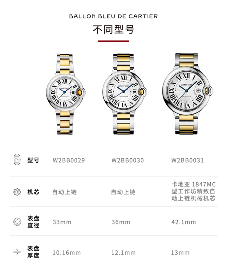 Ballon Bleu de Cartier卡地亚蓝气球腕表,33毫米表款,自动上链机械机芯。精钢表壳,750‰黄金凹槽式表冠,镶嵌一颗凸圆形合成尖晶石。镀银扭索雕纹表盘。剑形蓝钢指针。蓝宝石水晶镜面。可替换式750‰黄金与精钢表链。厚度:10.16毫米。防水深度3巴(约30米)。