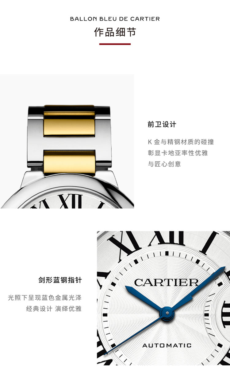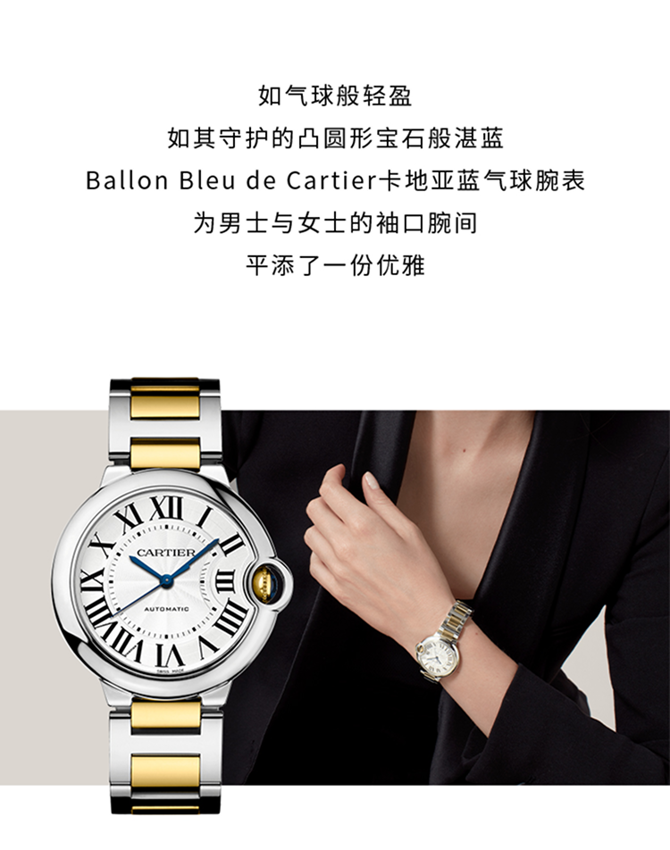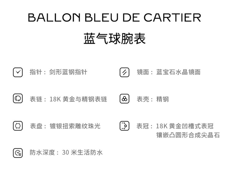 Ballon Bleu de Cartier卡地亚蓝气球腕表,42毫米表款,卡地亚1847 MC型工作坊精制自动上链机械机芯。精钢表壳,750‰黄金凹槽式表冠,镶嵌一颗凸圆形合成尖晶石。镀银扭索雕纹表盘。剑形蓝钢指针。蓝宝石水晶镜面。3时位置设日历显示窗。可替换式精钢750‰玫瑰金表链。厚度:13毫米。防水深度3巴(约30米)。