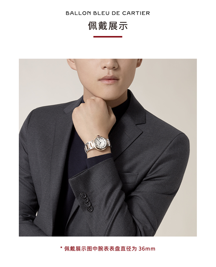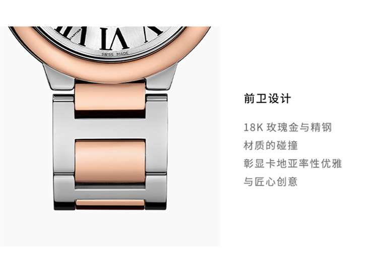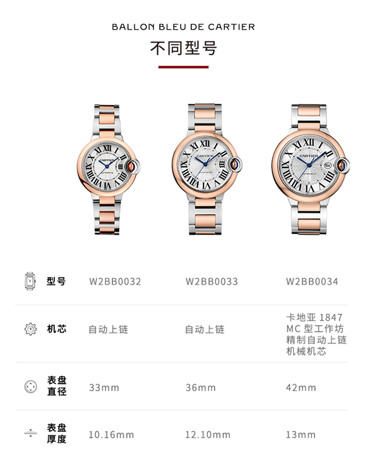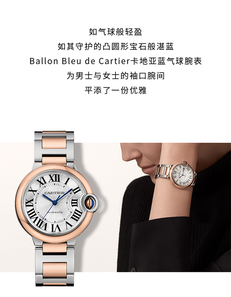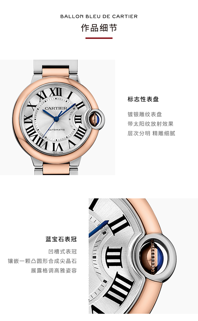 Ballon Bleu de Cartier卡地亚蓝气球腕表,42毫米表款,卡地亚1847 MC型工作坊精制自动上链机械机芯。精钢表壳,750‰玫瑰金表圈,750‰玫瑰金凹槽式表冠,镶嵌一颗凸圆形合成尖晶石。镀银扭索雕纹表盘。剑形蓝钢指针。蓝宝石水晶镜面。3时位置设日历显示窗。可替换式750‰玫瑰金与精钢表链。厚度:13毫米。防水深度3巴(约30米)。