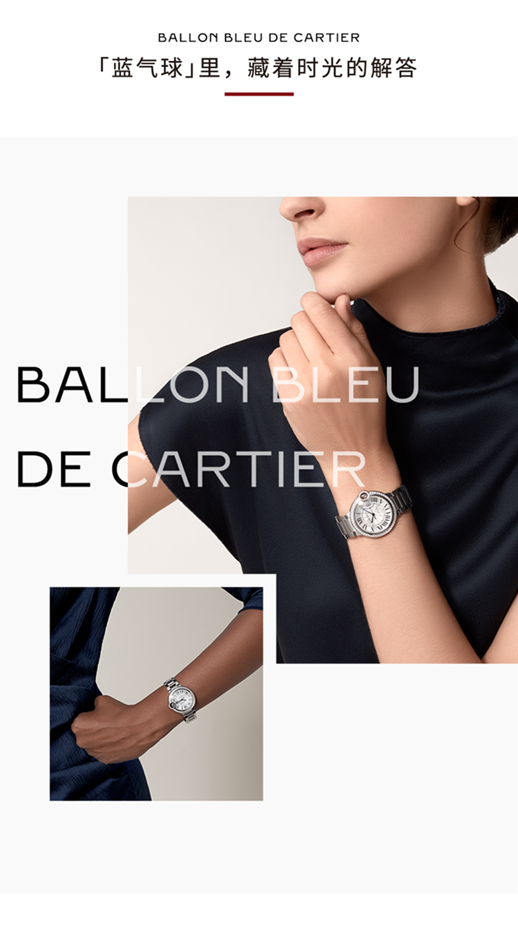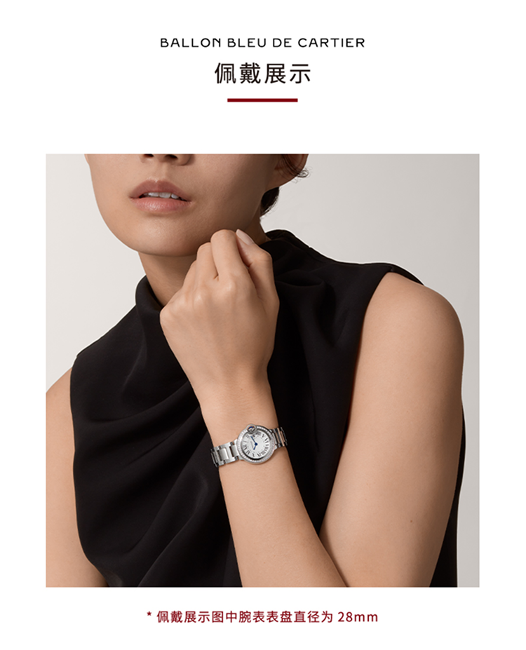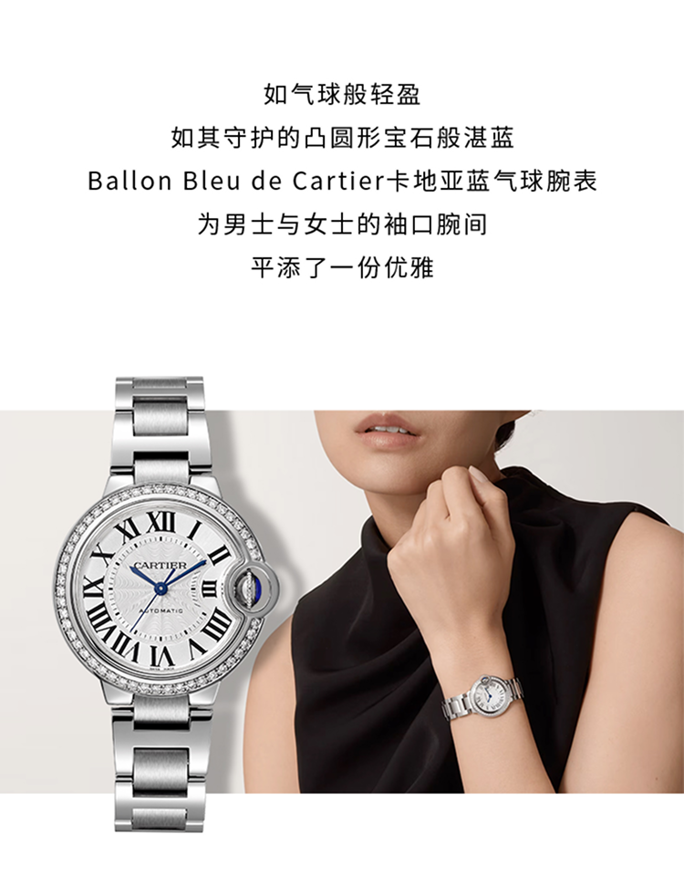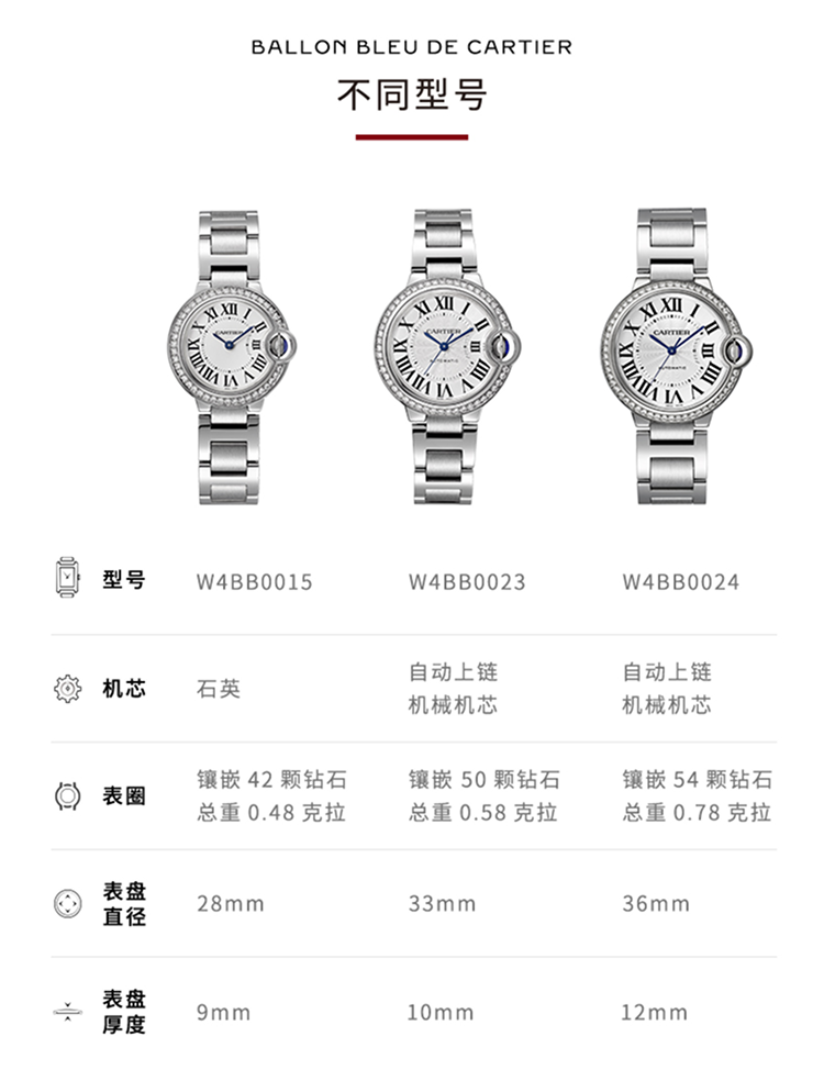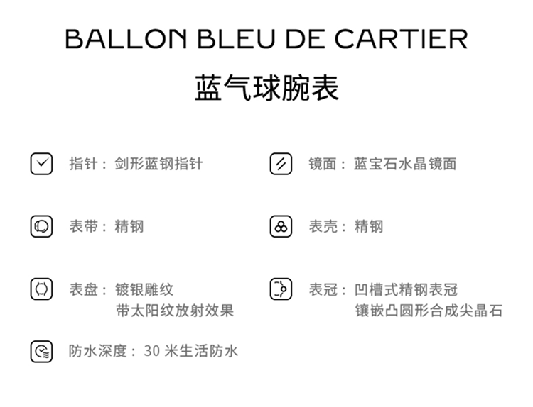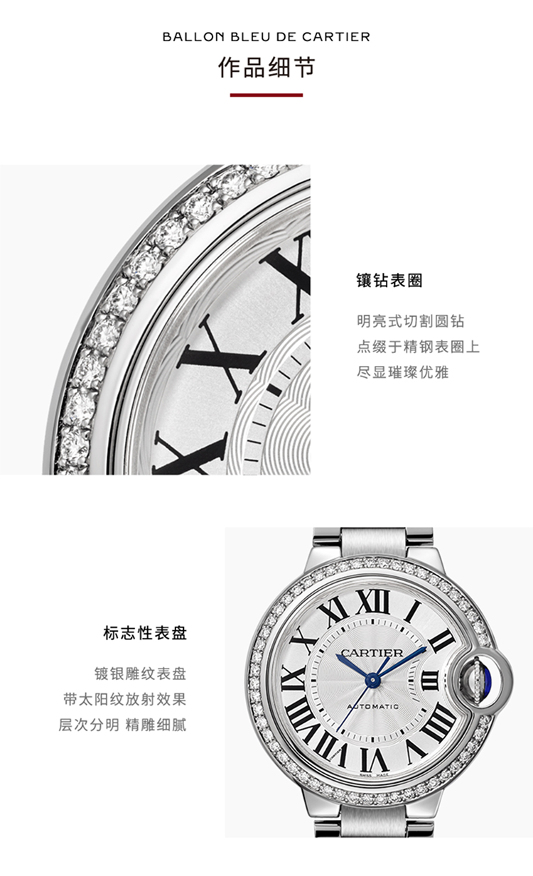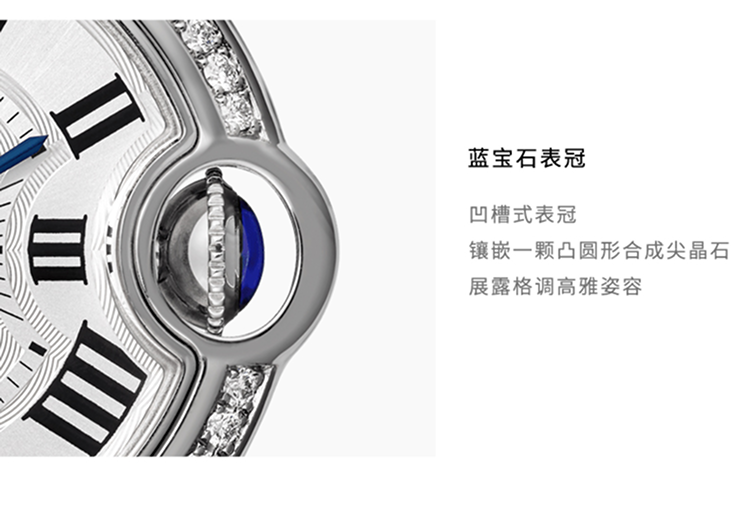 Ballon Bleu de Cartier卡地亚蓝气球腕表,36毫米表款,自动上链机械机芯。精钢表壳,精钢凹槽式表冠,镶嵌一颗凸圆形合成尖晶石。精钢表圈镶嵌54颗明亮式切割圆钻,总重0.78克拉。镀银扭索雕纹表盘。剑形蓝钢指针。蓝宝石水晶镜面。可替换式精钢表链。厚度:12.1毫米。防水深度3巴(约30米)。