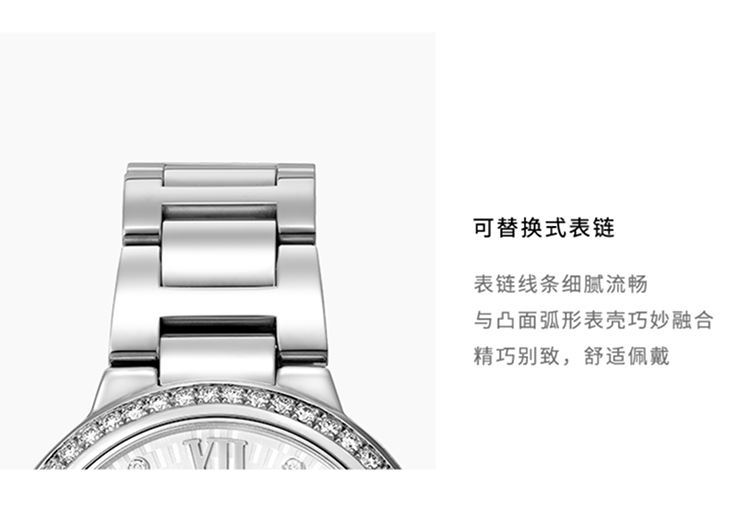 精钢表圈,镶嵌42颗明亮式切割圆钻,总重0.48克拉。镀银阳光射线纹饰表盘,镶嵌19颗明亮式切割圆钻,总重0.08克拉。