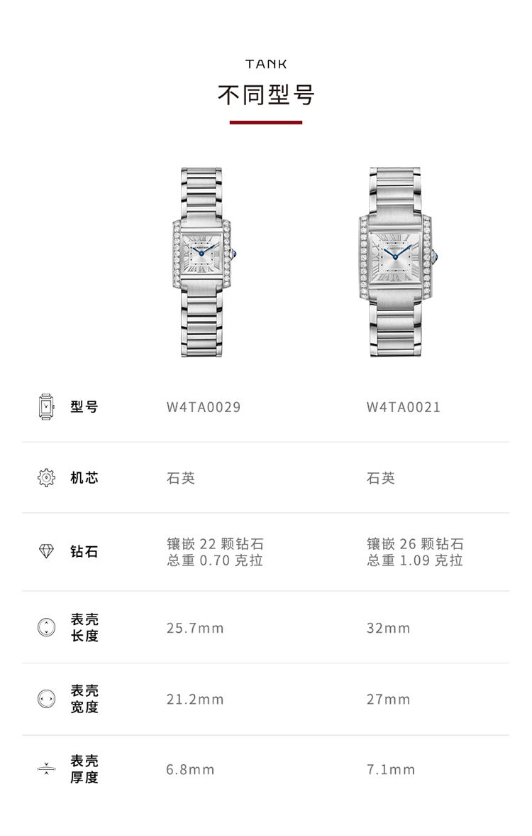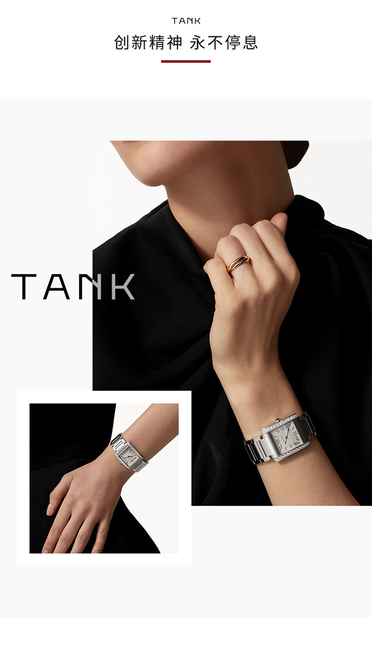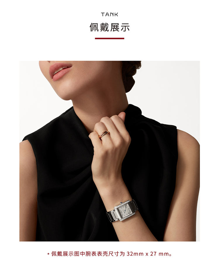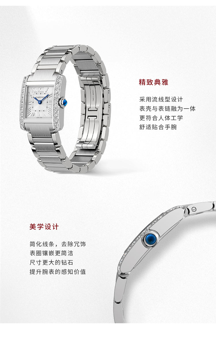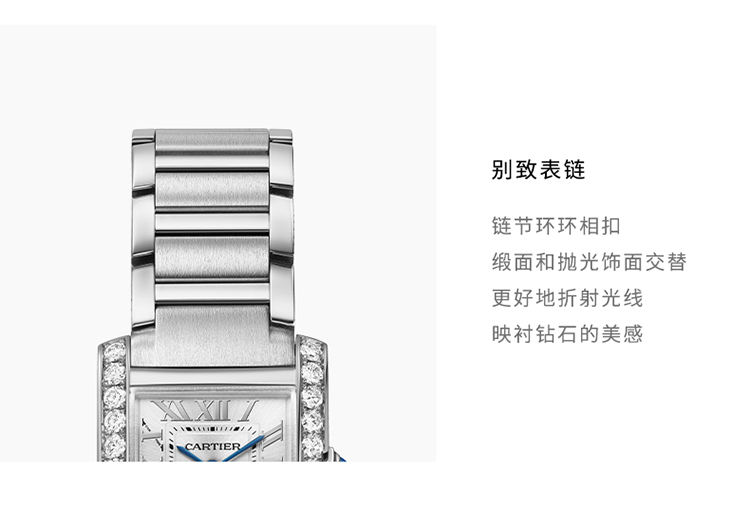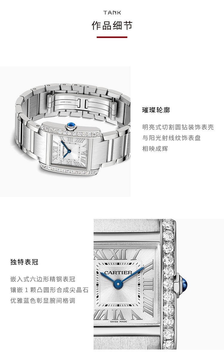 Tank Française腕表,中号表款,石英机芯。精钢表壳,镶嵌26颗明亮式切割圆钻,总重1.09克拉,精钢刻面表冠,镶嵌1颗蓝色凸圆形合成尖晶石。阳光射线纹饰镀银表盘,剑形蓝钢指针,合成蓝宝石水晶镜面。精钢表链。表壳尺寸:32毫米 x 27毫米,厚度:7.1毫米。生活防水深度3巴(约30米/100英尺)。