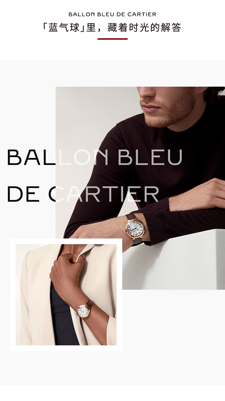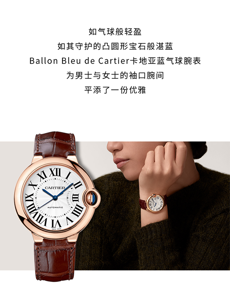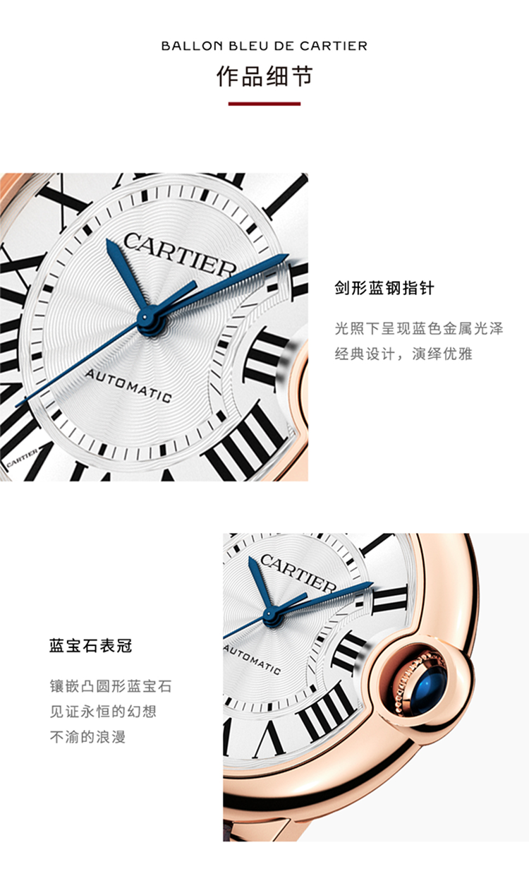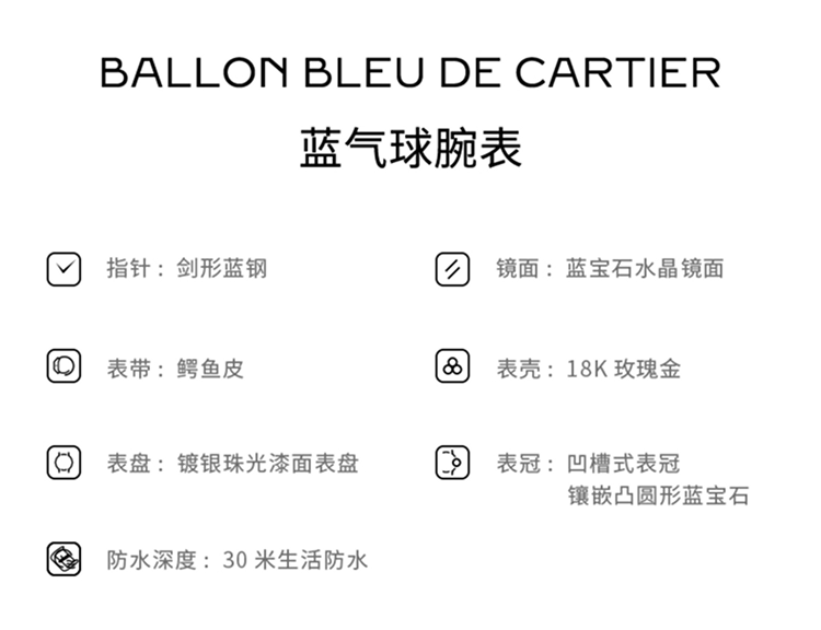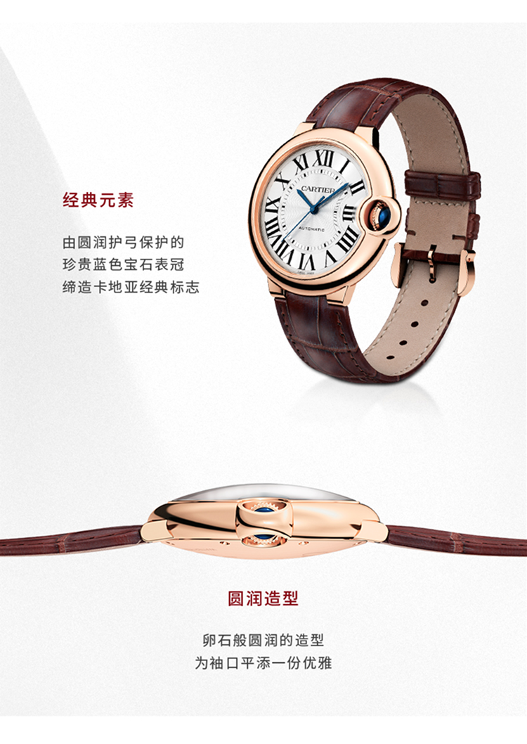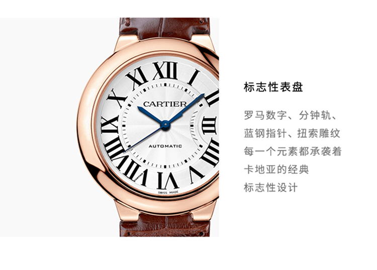 Ballon Bleu de Cartier卡地亚蓝气球腕表,33毫米表款,自动上链机械机芯。750‰玫瑰金表壳,凹槽式表冠,镶嵌一颗凸圆形蓝宝石,镀银珠光扭索雕纹漆面表盘,12枚罗马数字时标,剑形蓝钢指针,蓝宝石水晶镜面,鳄鱼皮表带,750‰玫瑰金针扣式表扣。表壳尺寸:直径:33毫米,表壳厚度:10.16毫米,防水深度3巴(约30米)。