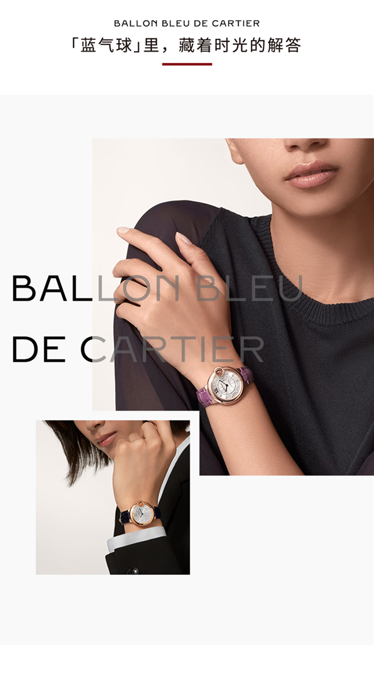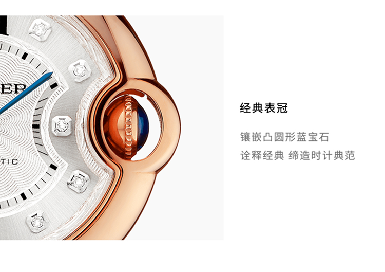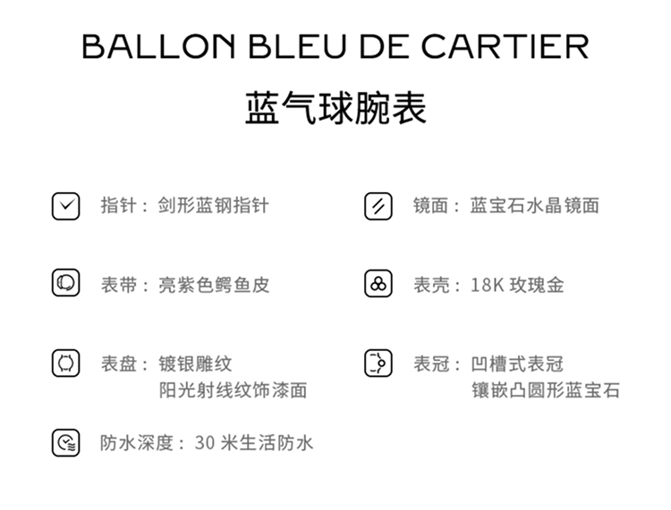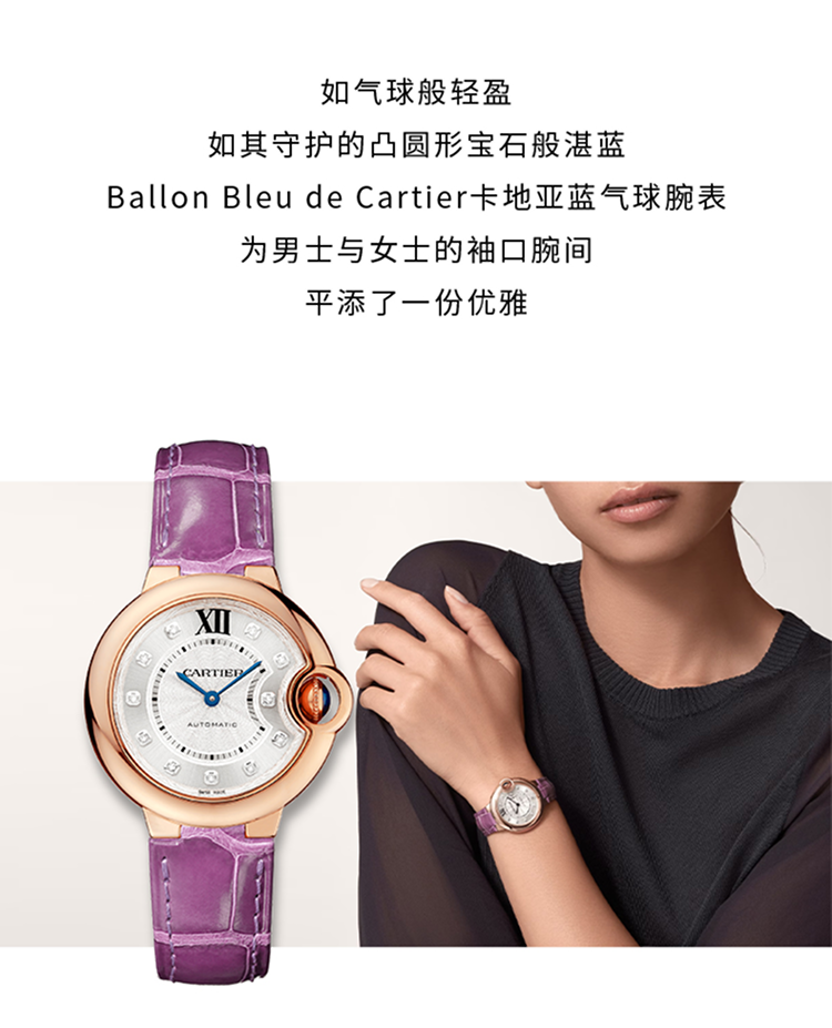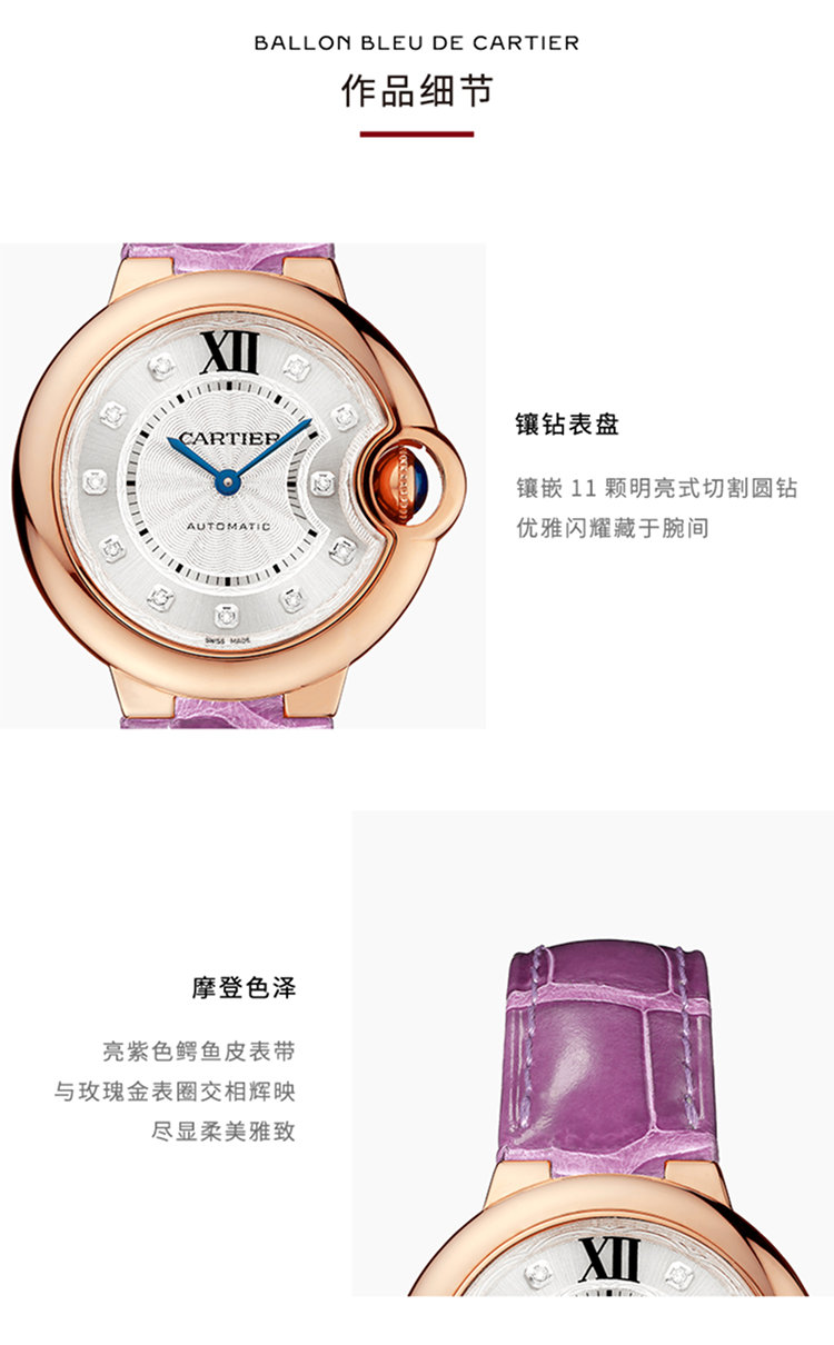 Ballon Bleu de Cartier卡地亚蓝气球腕表,33毫米表款,自动上链机械机芯。750‰玫瑰金表壳,凹槽式表冠,镶嵌一颗凸圆形蓝宝石。镀银雕纹阳光射线纹饰漆面表盘,镶嵌11颗钻石,总重0.05克拉。剑形蓝钢指针。蓝宝石水晶镜面。亮紫色鳄鱼皮表带,14毫米750‰玫瑰金针扣式表扣。厚度:10.16毫米。防水深度3巴(约30米)。