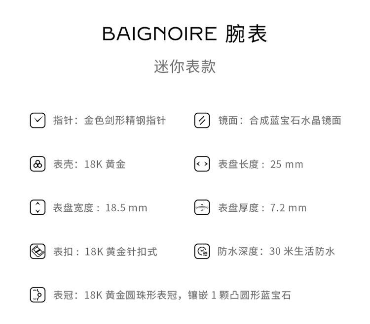 Baignoire de Cartier腕表,迷你表款,石英机芯。750/1000黄金表壳。750/1000黄金圆珠形表冠,镶嵌一颗凸圆形蓝宝石。棕色漆艺表盘,金色剑形精钢指针,合成蓝宝石水晶镜面。棕色磨砂小牛皮表带,750/1000黄金针扣式表扣。长度:24.6毫米,宽度:18.7毫米,厚度:7.2 毫米。生活防水深度3巴(约30米)。