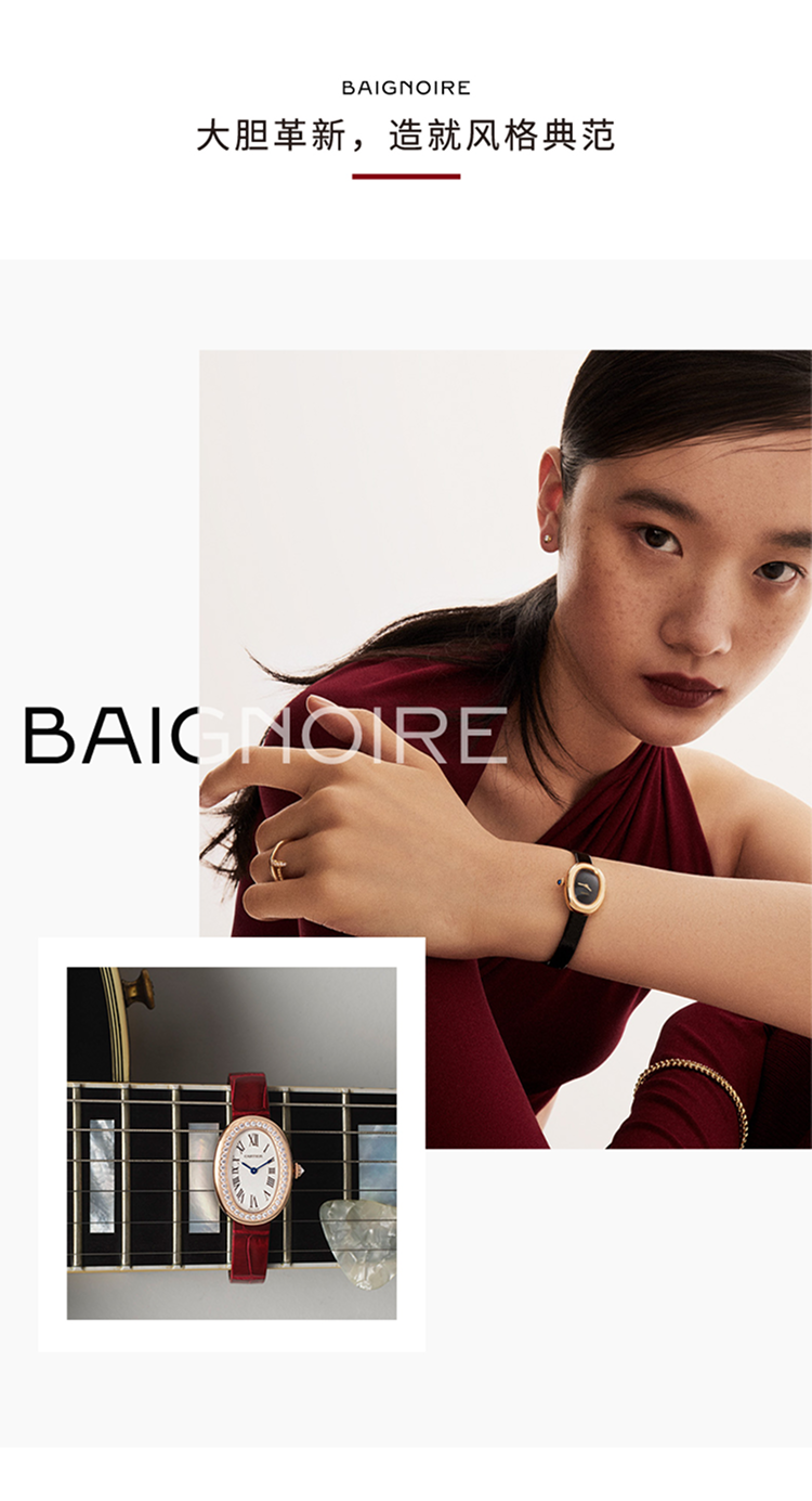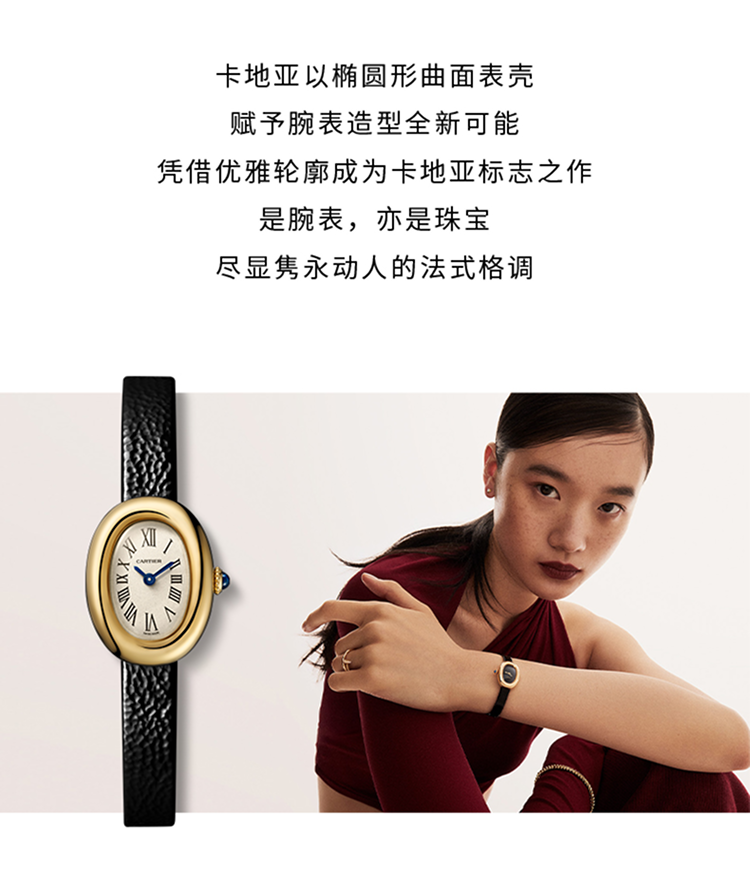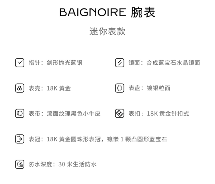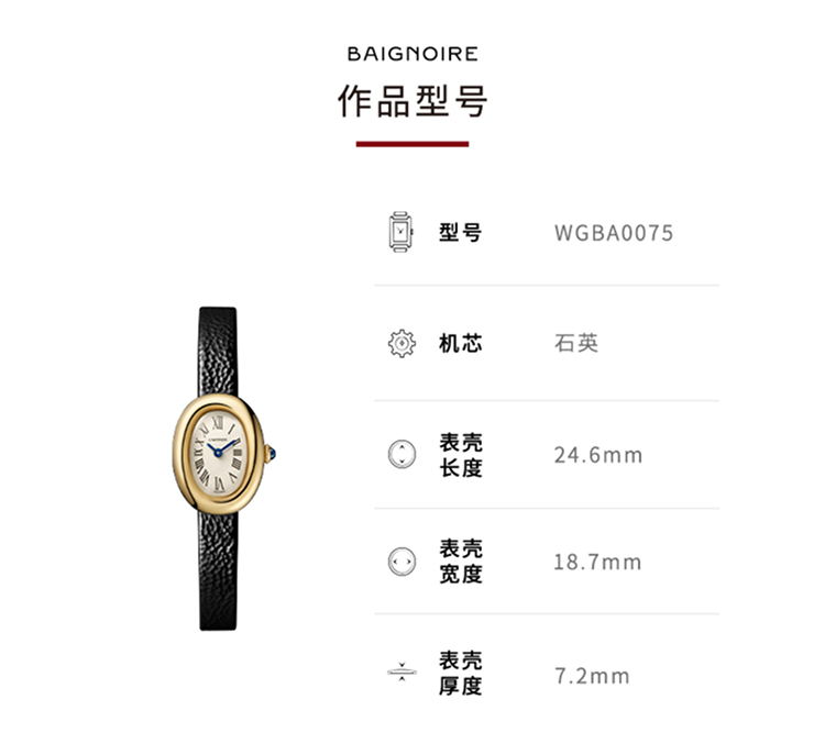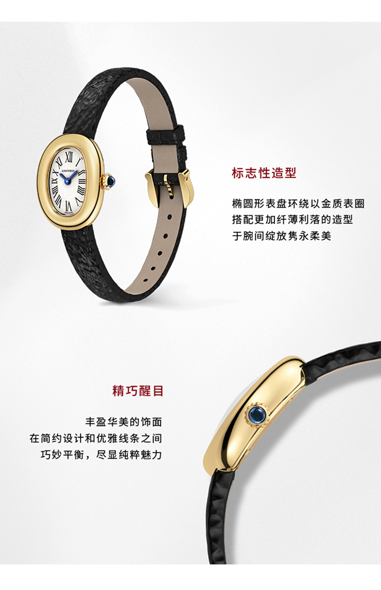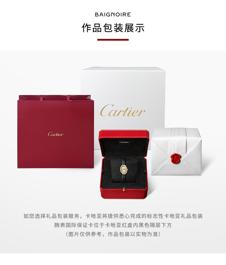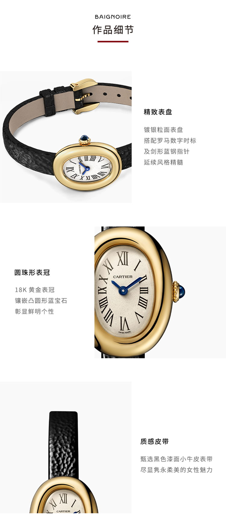 Baignoire腕表,迷你表款,石英机芯。750/1000黄金表壳。750/1000黄金圆珠形表冠,镶嵌1颗凸圆形蓝宝石。镀银表盘,剑形蓝钢指针,合成蓝宝石水晶镜面。黑色漆皮表带,750/1000黄金针扣式表扣。长度:24.6毫米。宽度:18.7毫米。厚度:7.2毫米。生活防水深度3巴(约30米)。