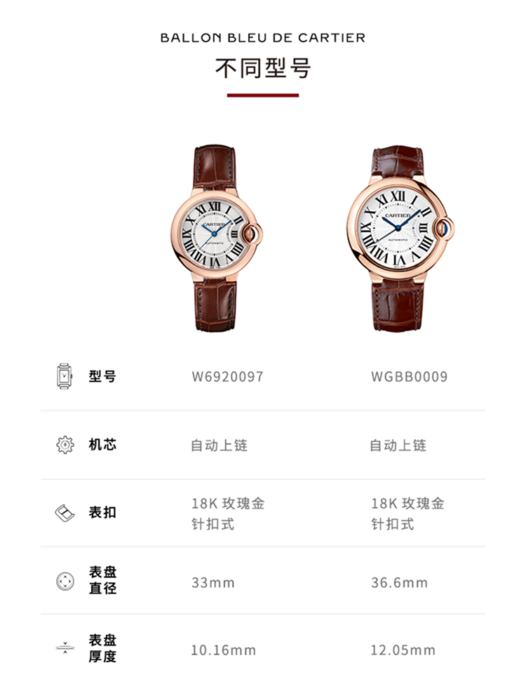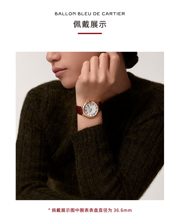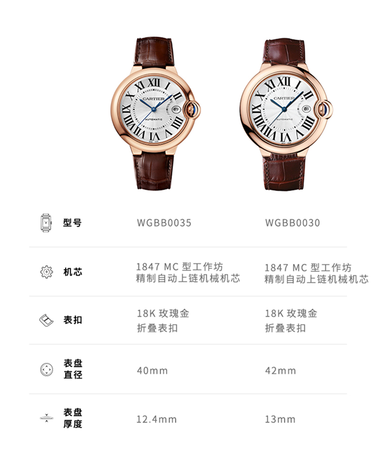 Ballon Bleu de Cartier卡地亚蓝气球腕表,42毫米表款,卡地亚1847 MC型工作坊精制自动上链机械机芯。750‰玫瑰金表壳,凹槽式表冠镶嵌一颗凸圆形蓝宝石,镀银扭索雕纹漆面珠光表盘。剑形蓝钢指针。蓝宝石水晶镜面。棕色鳄鱼皮表带,可替换式750‰玫瑰金折叠表扣。3时位置设日历显示窗。厚度:13毫米。防水深度3巴(约30米)。