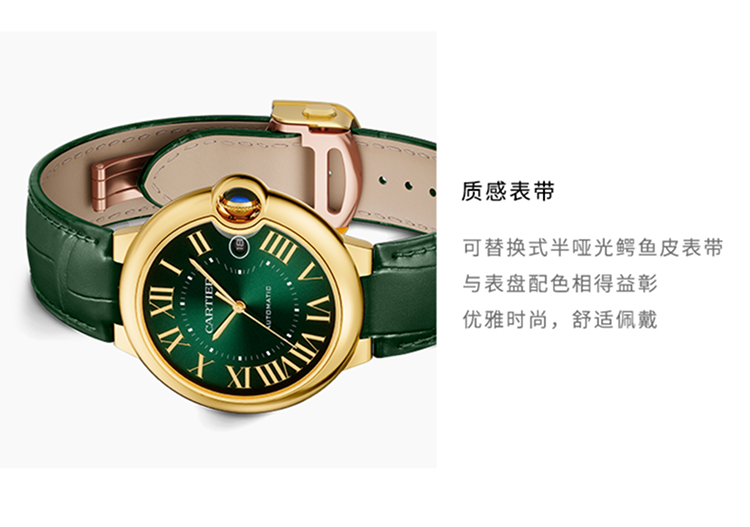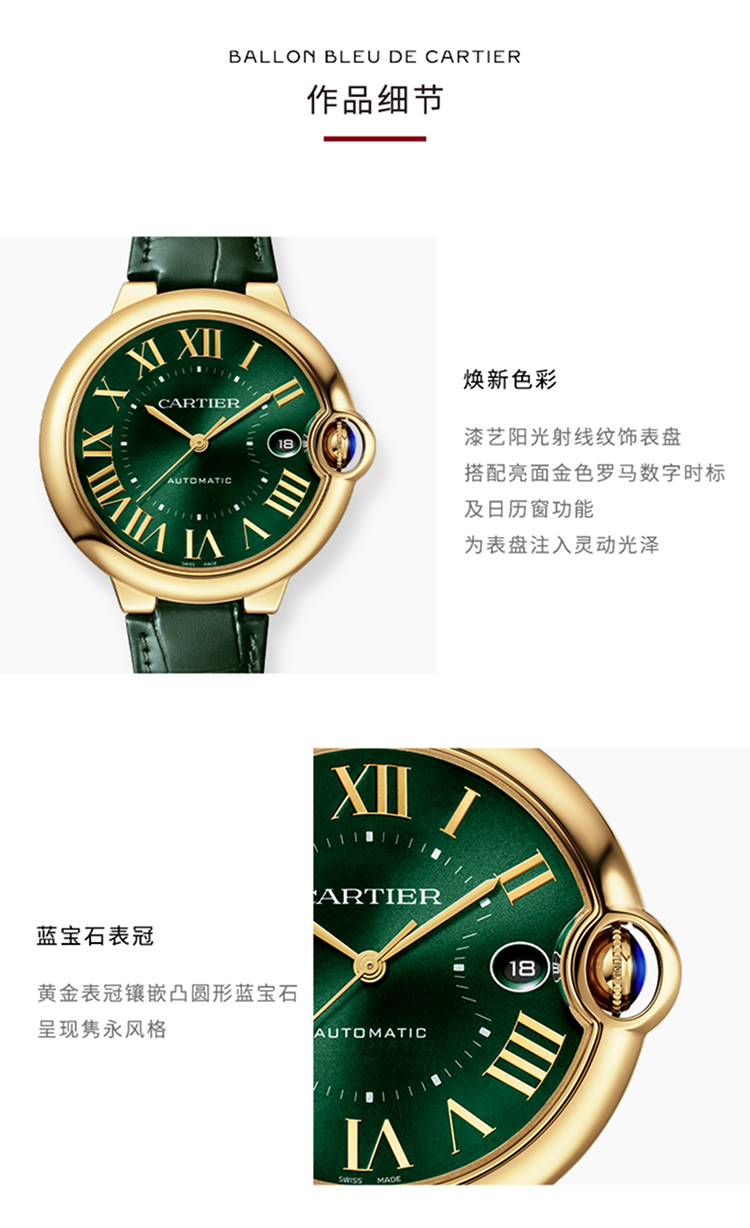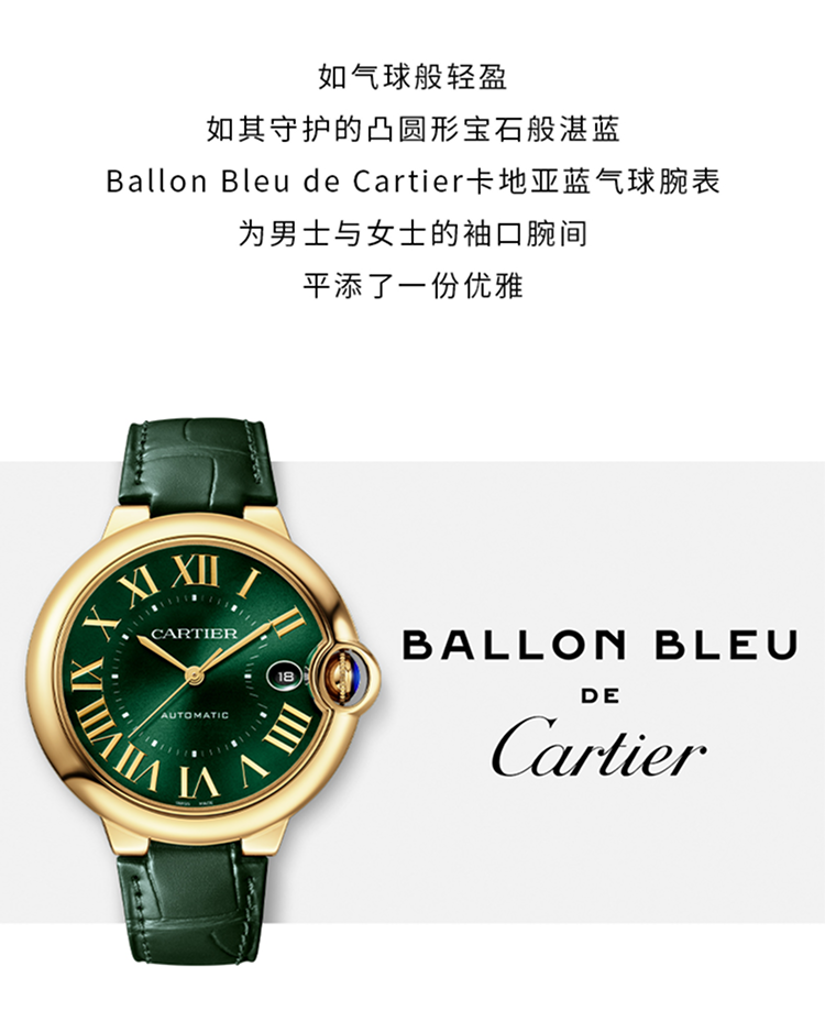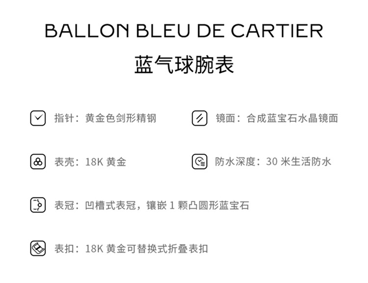 Ballon Bleu de Cartier卡地亚蓝气球腕表,40毫米,卡地亚工作坊精制1847 MC型自动上链机械机芯。750/1000黄金表壳,凹槽式表冠,镶嵌1颗凸圆形蓝宝石,蓝色阳光射线纹饰表盘,金色剑形精钢指针。合成蓝宝石水晶镜面。一条可替换式深蓝色鳄鱼皮表带,750/1000黄金可替换式折叠表扣,3时位置设日期显示窗。厚度:12.4毫米。生活防水深度3巴(约30米)。