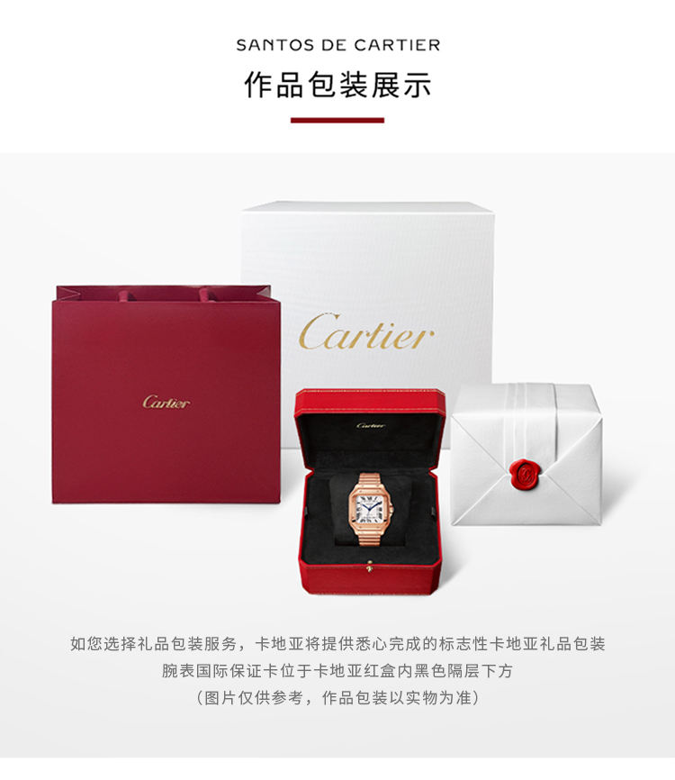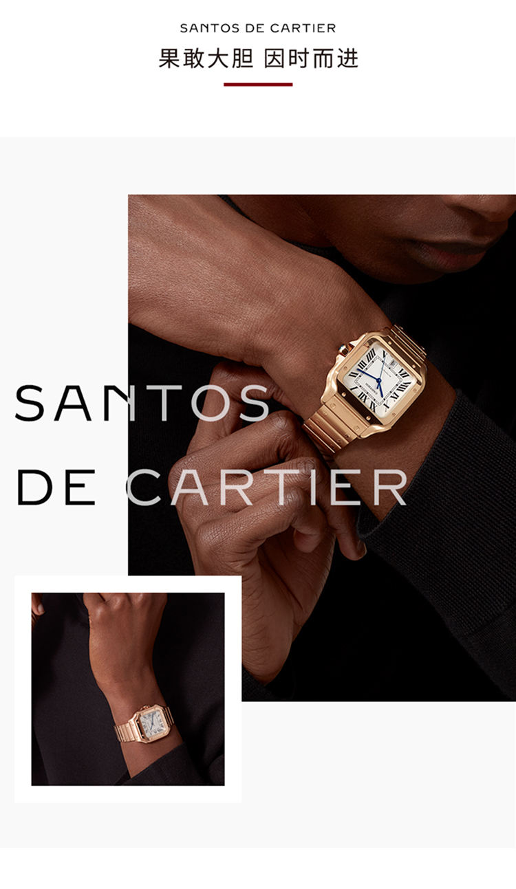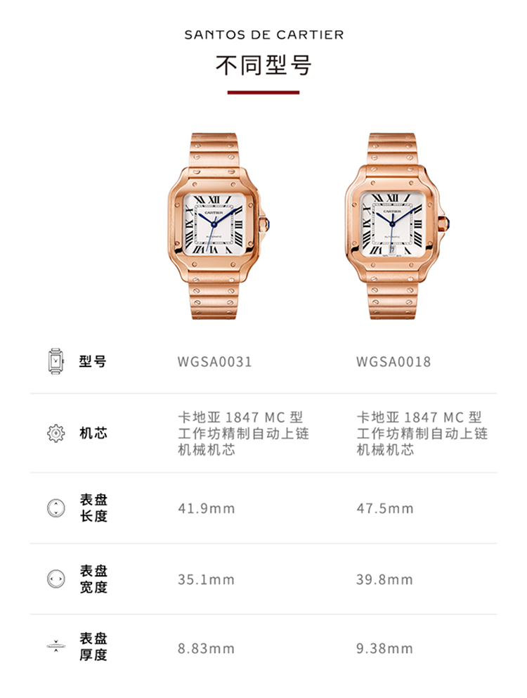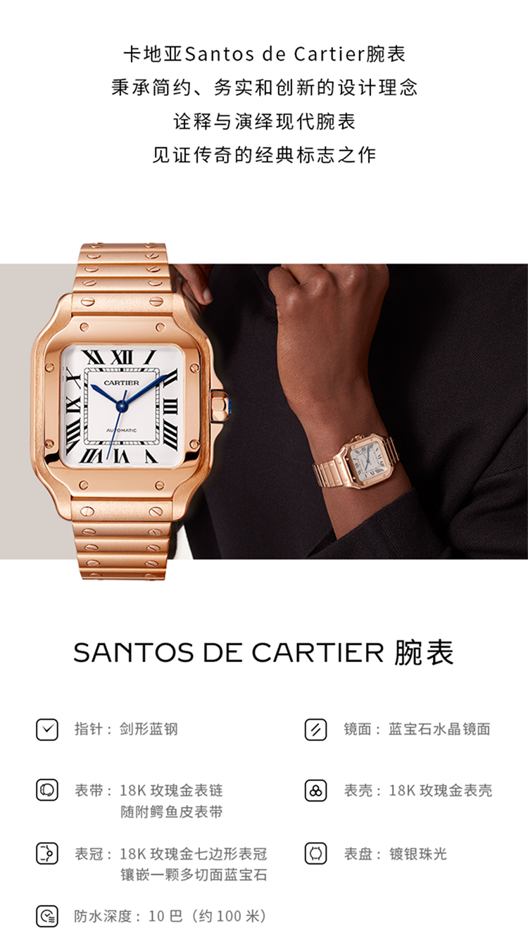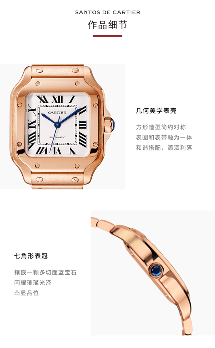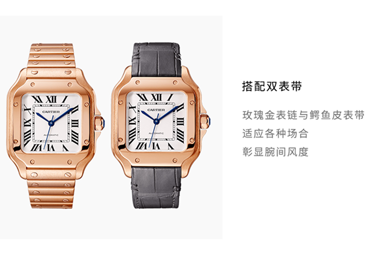 Santos腕表,大号表款,卡地亚1847 MC型工作坊精制自动上链机械机芯。750‰玫瑰金表壳,750‰玫瑰金七边形表冠,镶嵌一颗多切面蓝宝石,镀银珠光表盘,剑形蓝钢指针,蓝宝石水晶镜面。 750‰玫瑰金表链,配备“SmartLink”表链调节装置。第二条鳄鱼皮表带,搭配可替换750‰玫瑰金折叠表扣。这两条表带均配备“QuickSwitch”表带快速替换装置。表壳宽度:39.8毫米,厚度:9.38毫米。防水深度10巴(约100米)。