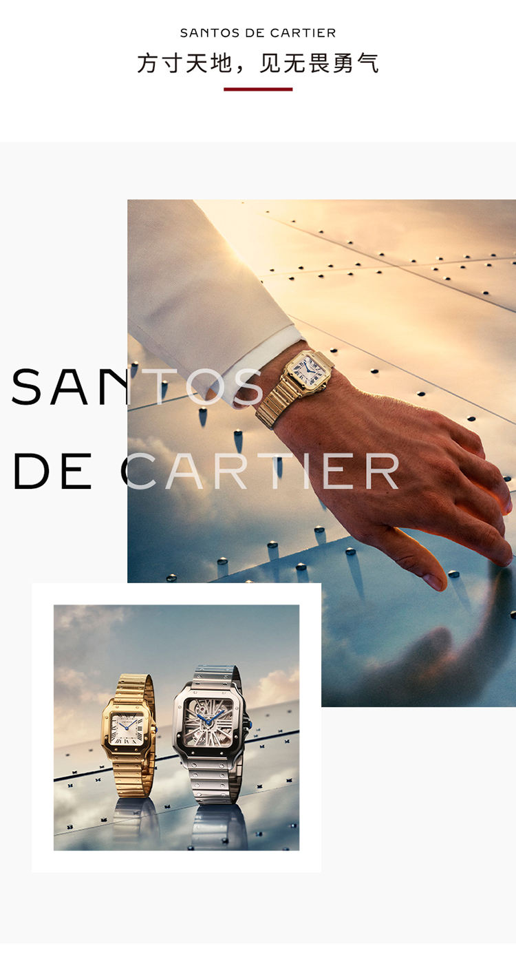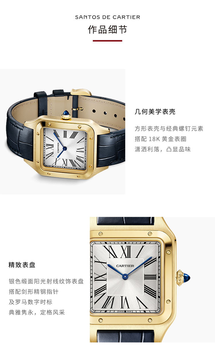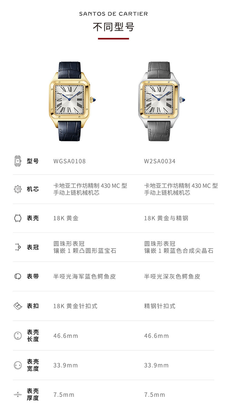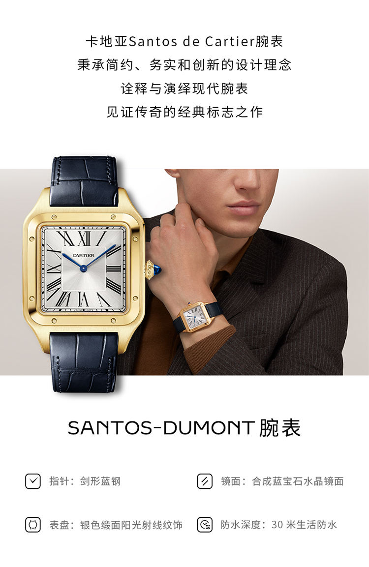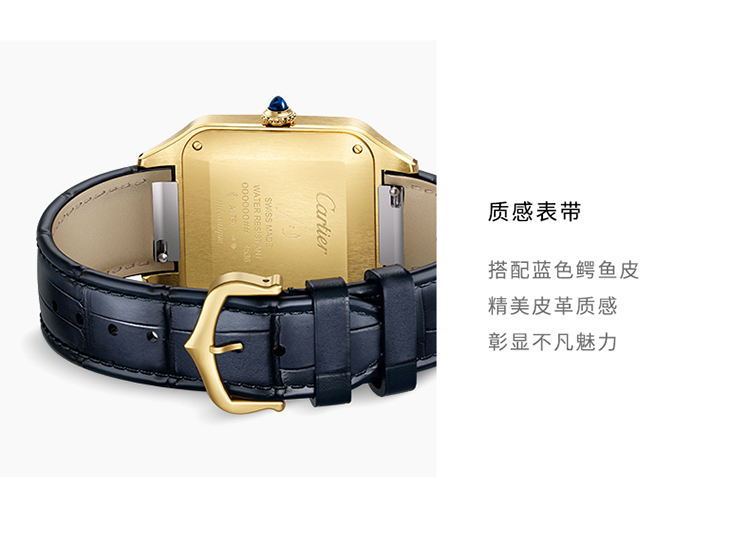 Santos-Dumont腕表,超大号表款,卡地亚工作坊精制430 MC型手动上链机械机芯。750/1000黄金表壳,圆珠形表冠,镶嵌1颗凸圆形蓝宝石,银色缎面阳光射线纹饰表盘,罗马数字时标,剑形蓝钢指针,合成蓝宝石水晶镜面。蓝色鳄鱼皮表带,750/1000黄金针扣式表扣。表壳尺寸:46.6毫米 x 33.9毫米,厚度:7.5毫米。生活防水深度3巴(约30米)。