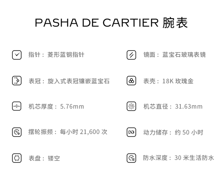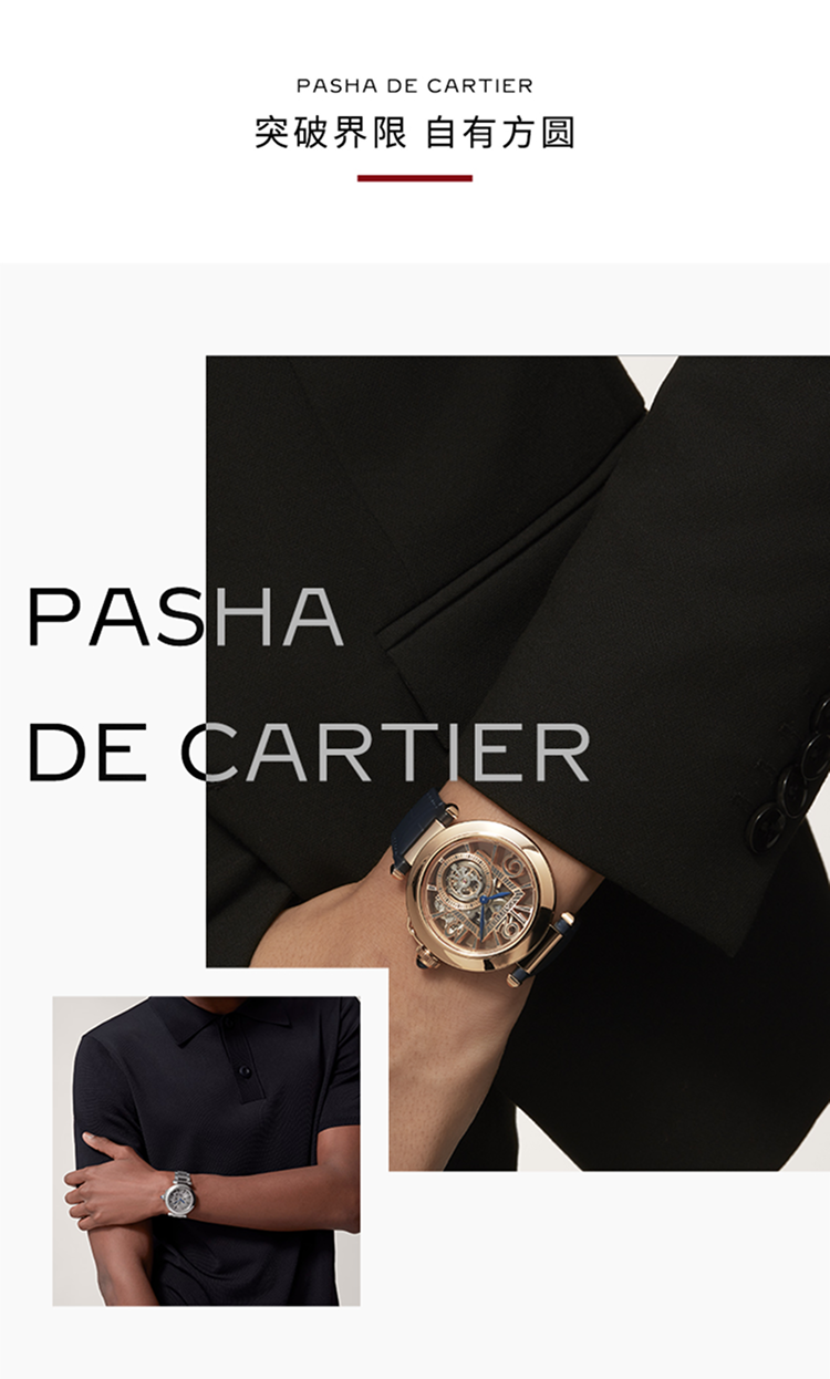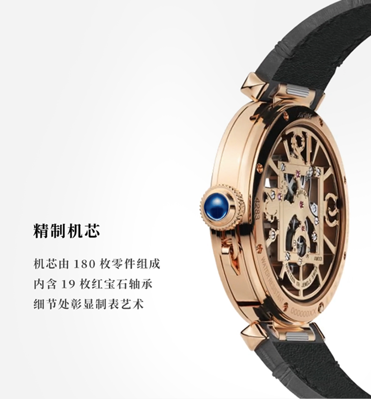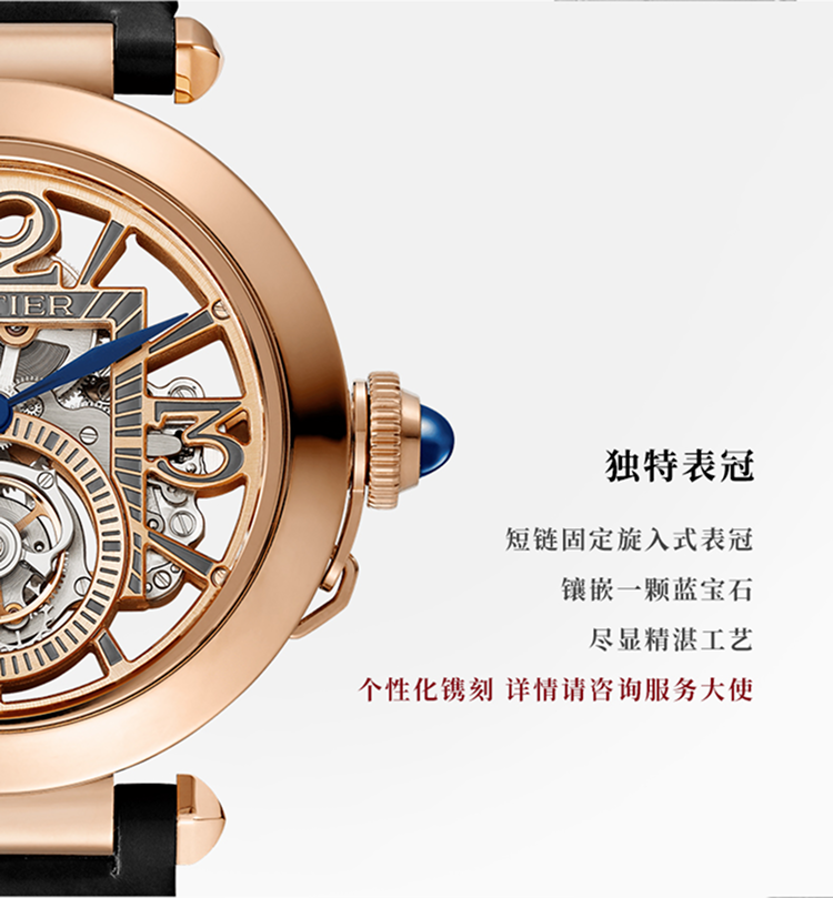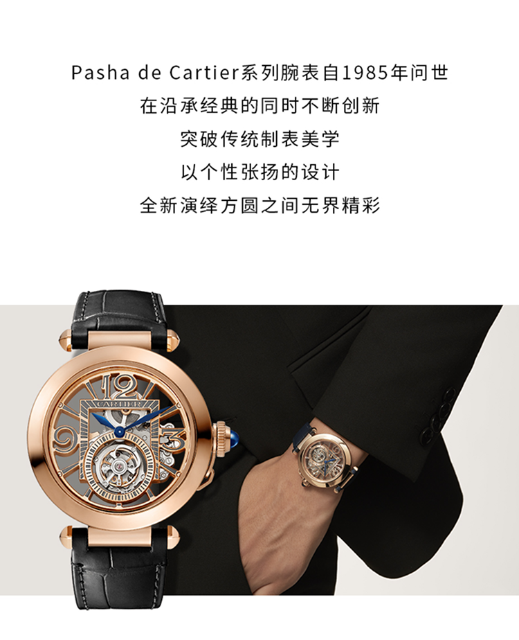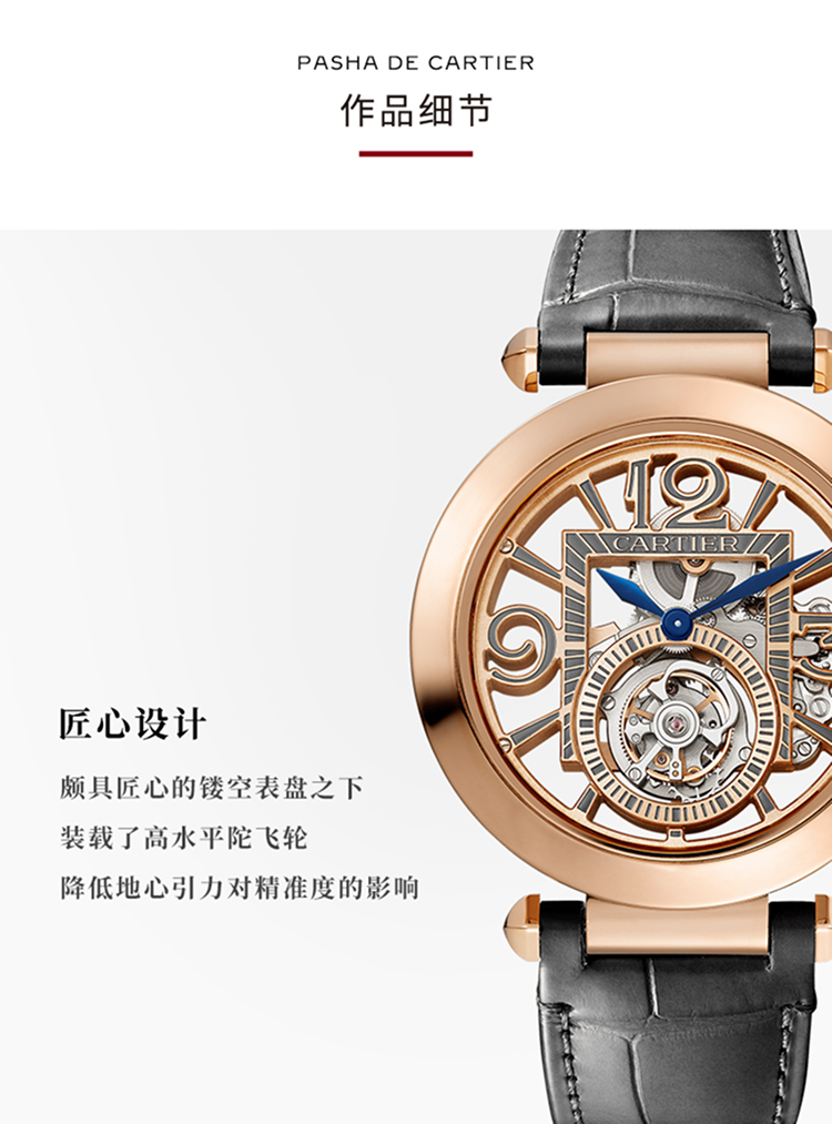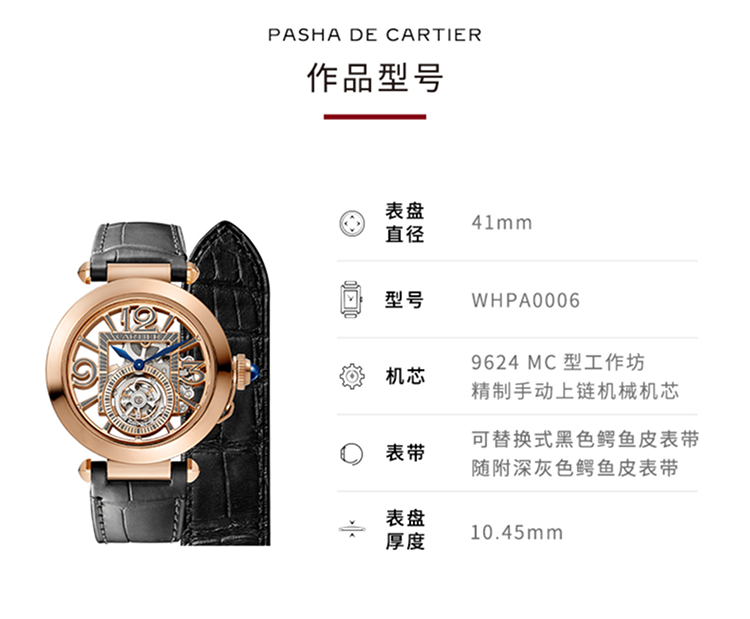 Pasha de Cartier腕表,41毫米表款,陀飞轮,镂空,卡地亚9466 MC型工作坊精制手动上链机械机芯。750‰玫瑰金表壳,旋入式表冠镶嵌一颗蓝宝石,菱形蓝钢指针,黑色和深灰色鳄鱼皮表带,配备QuickSwitch表带快速替换系统,可替换式750‰玫瑰金折叠表扣。阿拉伯数字形镂空表桥显示小时和分钟。机芯由180枚零件组成,其中包含19枚红宝石轴承。机芯直径:31.63毫米,机芯厚度:5.76毫米,摆轮振频:每小时21,600次。动力储存:约50小时。表壳直径:41毫米。厚度:10.45毫米。防水深度3巴(约30米)。
